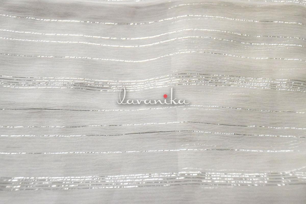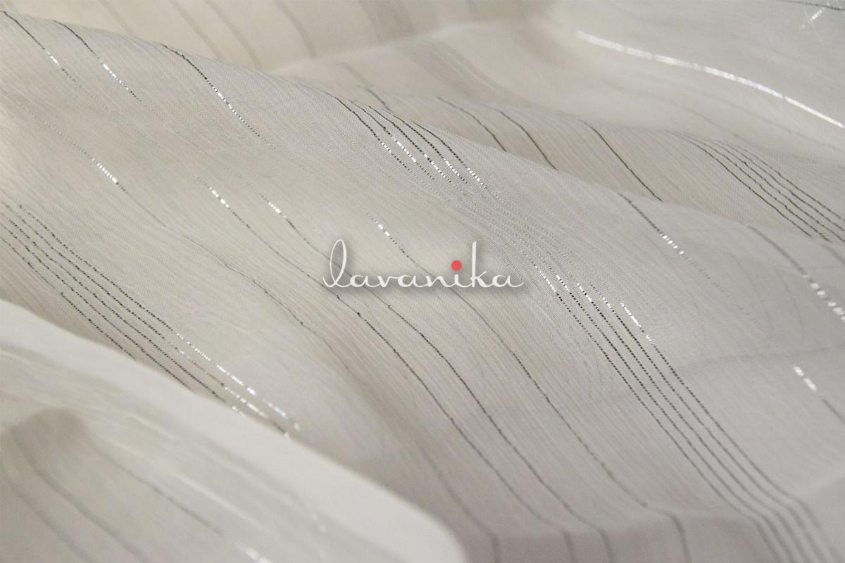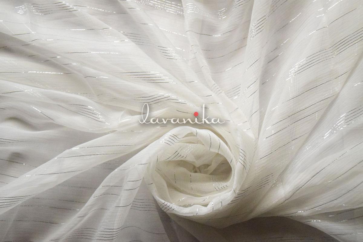 Silver Zari work Lines on Dyeable Bemberg Chiffon fabric is an all time classic design that can be used to create such a huge variety of classic as well as contemporary clothes. This design is equally favoured both in menswear as well as womenswear. This can also be used to make some interesting upholstery. please test a swatch for neon colors.