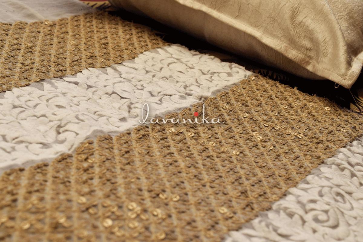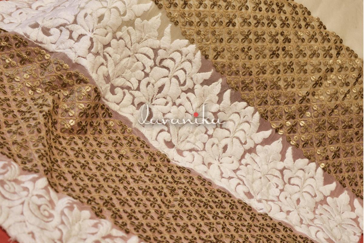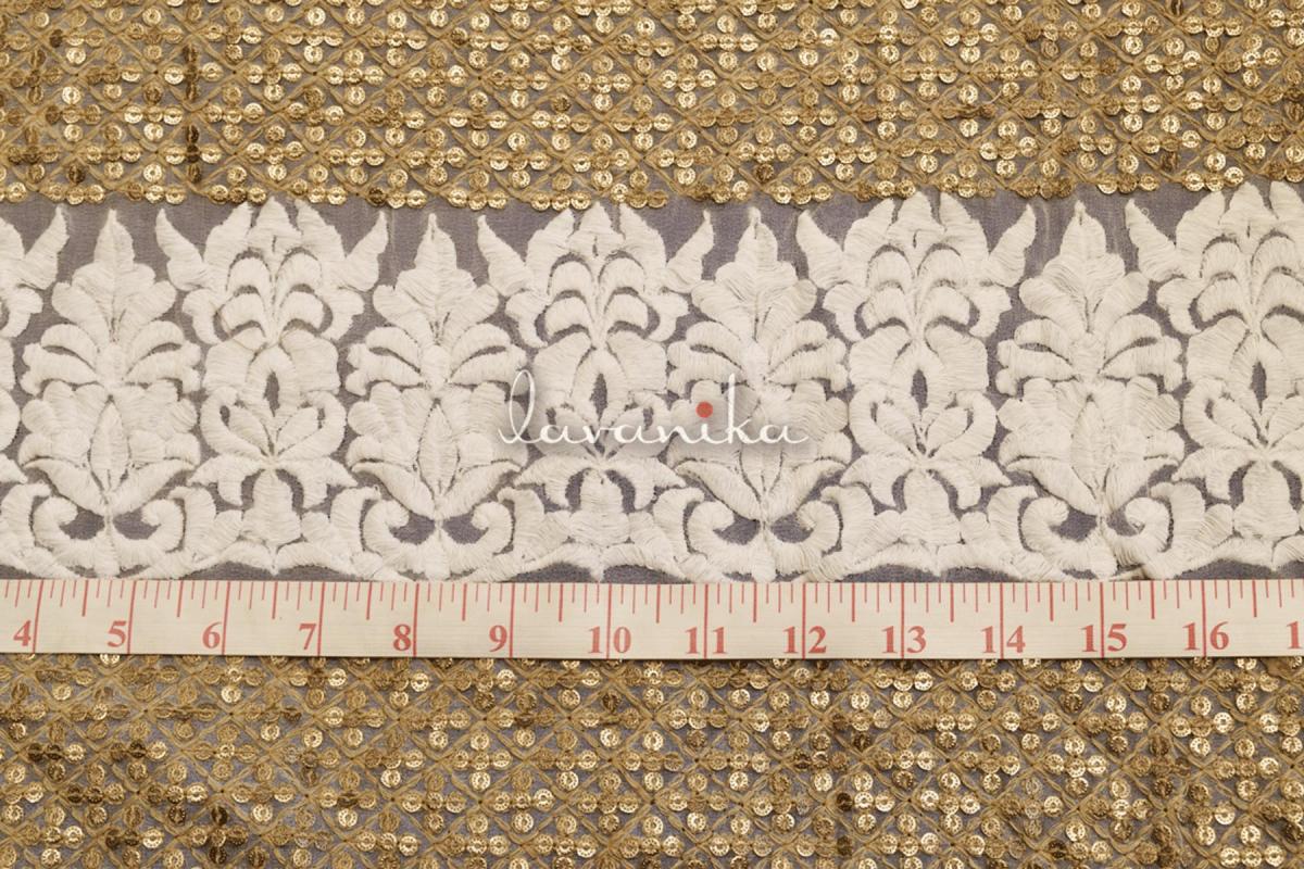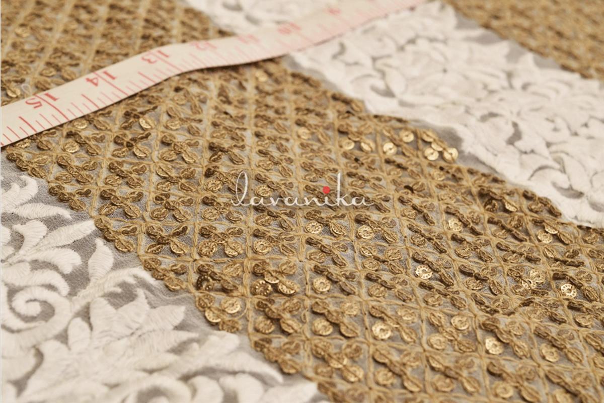 Alternate lines of Sequin Work and Thread Embroidery on Viscose Georgette are perfect for suits, saree borders, blouses, dresses and lehengas. Fabric width of 44 inches and work width of 36-39 inches.