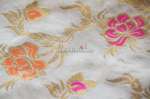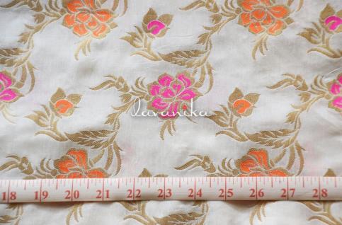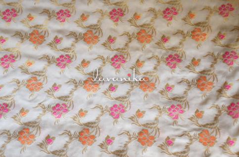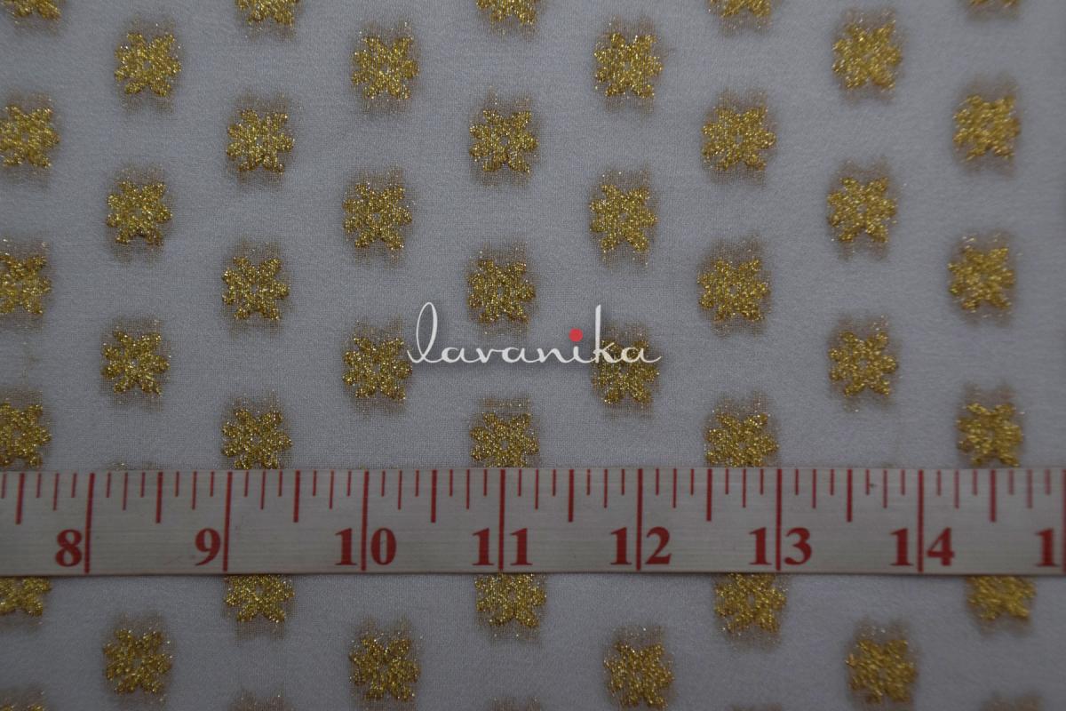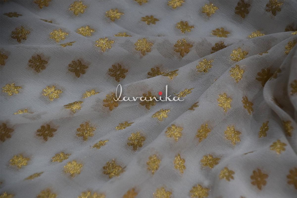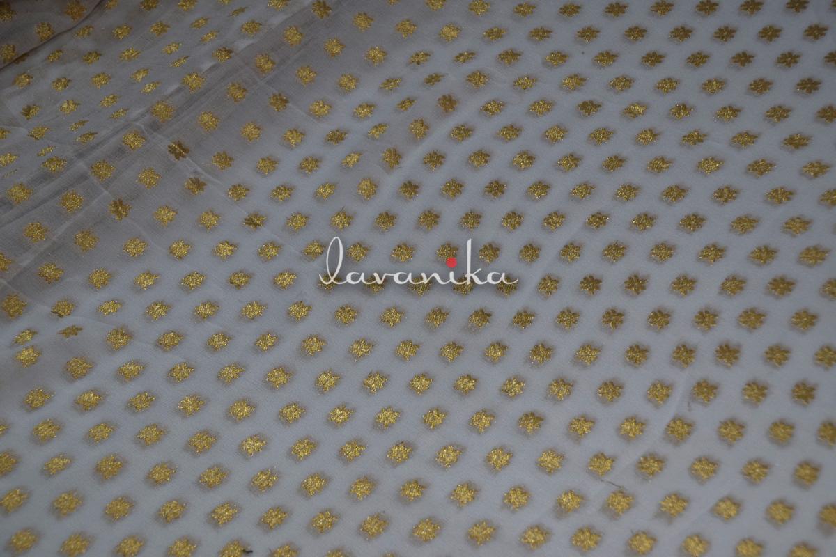 Beautiful banarasi jacquard zari buttis on premium quality Viscose Georgette fabric has a smooth finish and a soft handfeel. It can be used alone or over other fabrics for fitted to loosely fitted blouses, dresses, sarees, lehengas and other evening wear. It can also be used to create various types of accessories and upholstery. The fabric is dyeable.