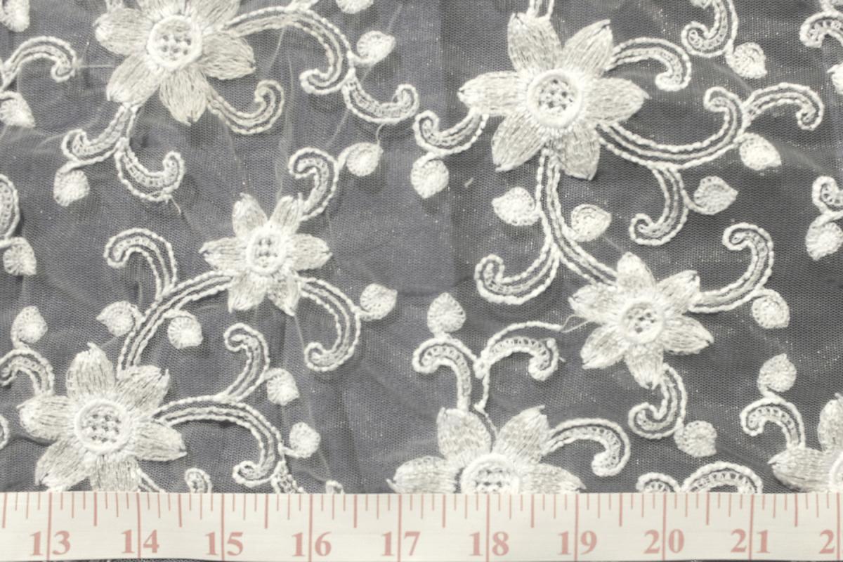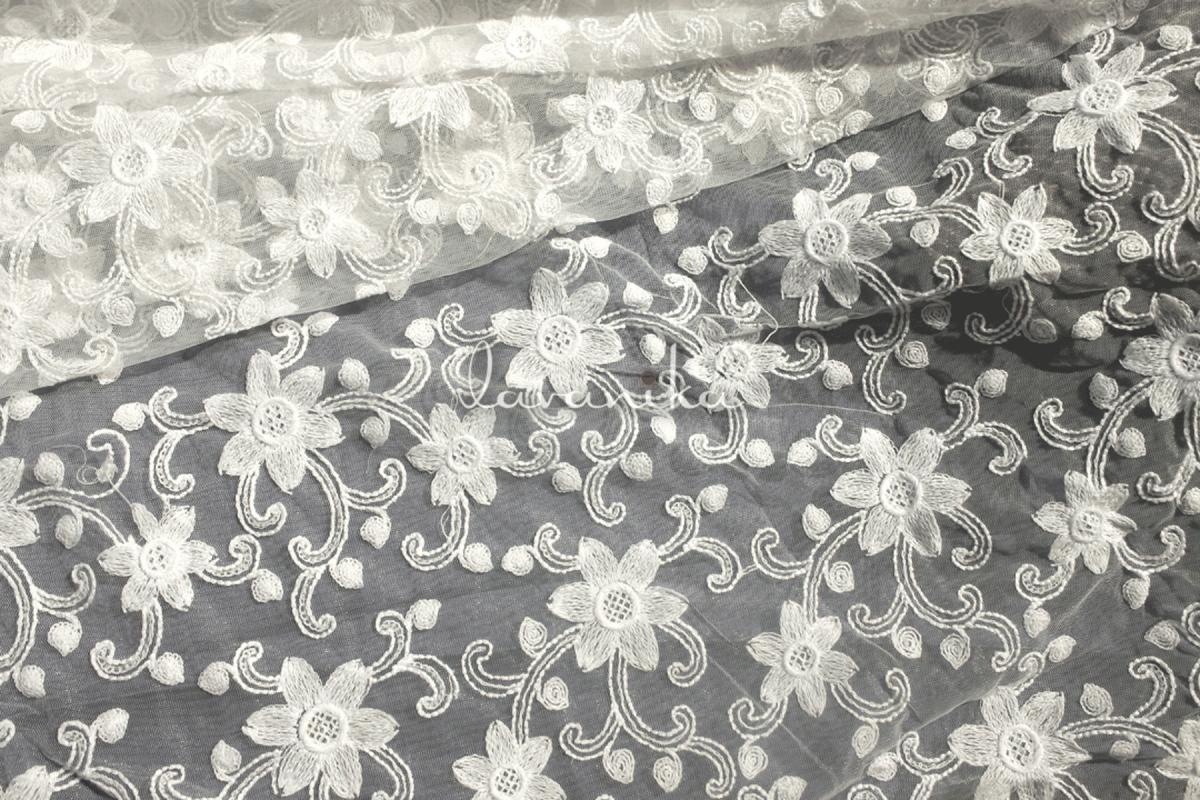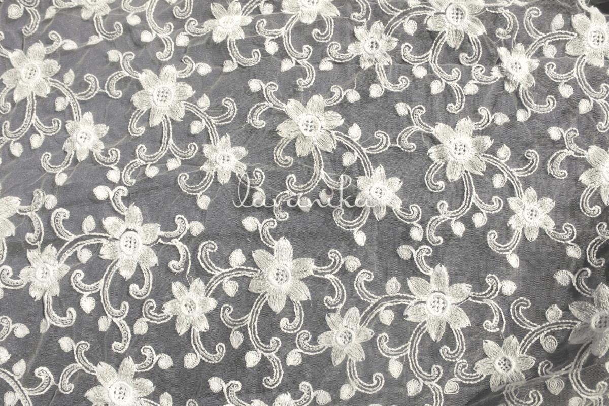 Cotton thread embroidered florals on dyeable nylon net are perfect for creating lehengas, sarees, dresses, heavy blouses and party suits. These can also be used for creating home linen. Fabric width is 44 inches and work width is 39-40 inches