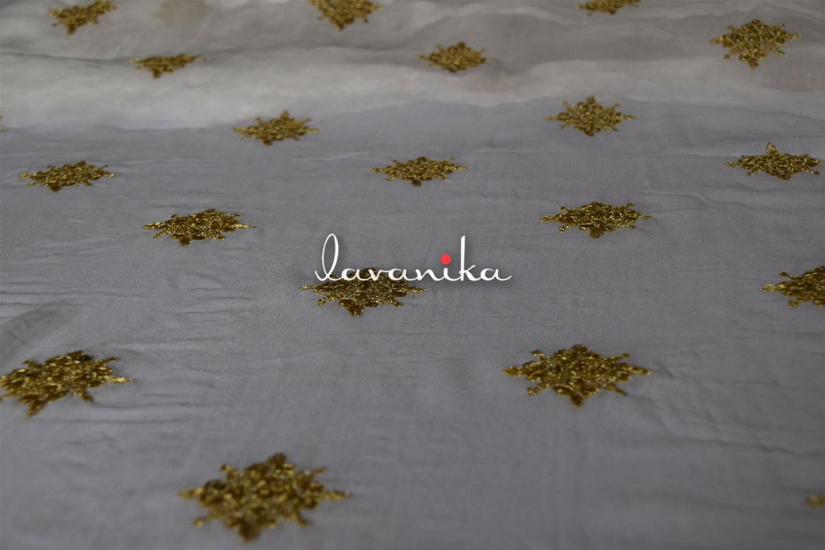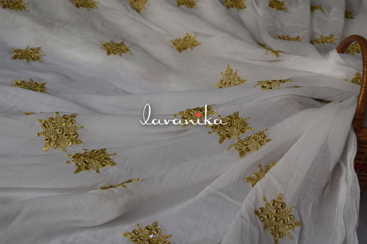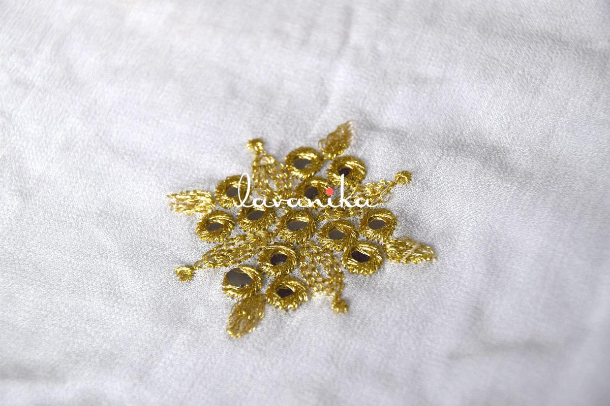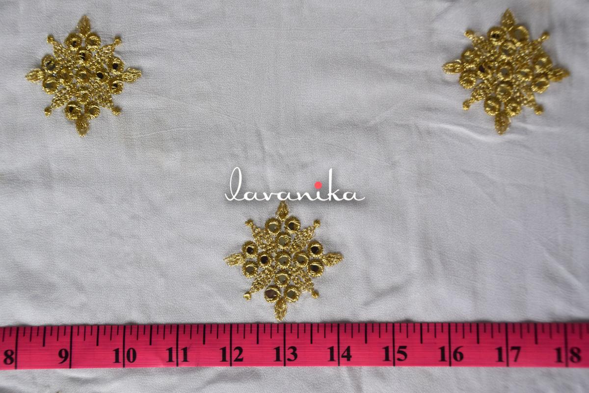 Faux mirror embroidery with Golden Zari on Dyeable Viscose Georgette Fabric is sure to make every outfit look gorgeous. Fabric width is 44 inches and work width is 36-39 inches. Please check a small swatch for colors as sometimes viscose does not take exact shades of neons and very bright colors