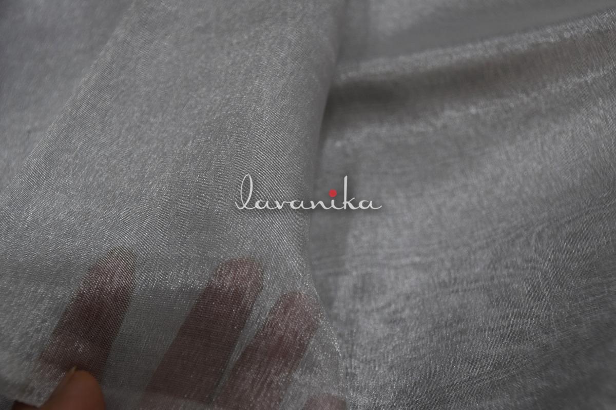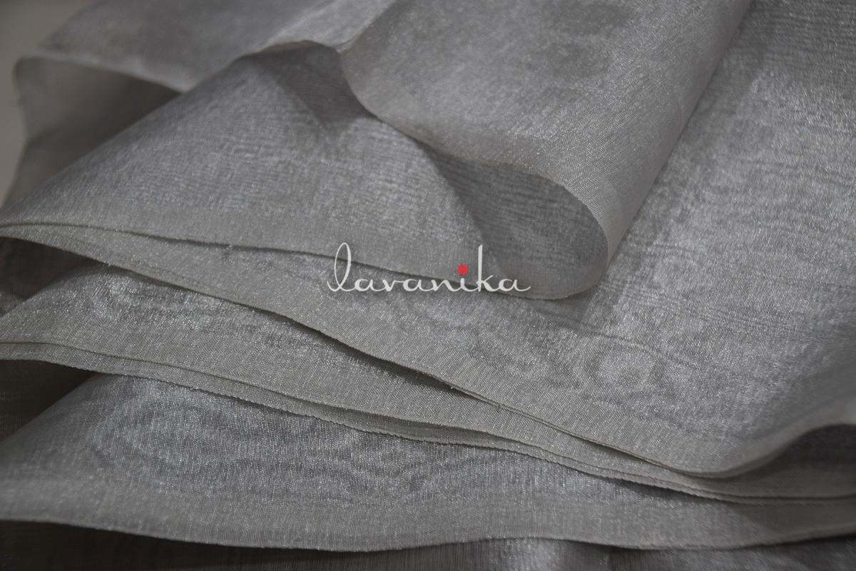 Pure Silk Tissue Organza fabric in Silver tone is a fine crisp fabric which has strength as well as flexibility. The fabric is made by intertwinig of dyeable silk thread with fine silver Zari. This fabric is dyeable and looks very rich as the color that is dyed is highlighted with metallic silver sheen of the zari thread. This fabric is an Excellent choice to make formal dresses, ethnic costumes, wedding dresses, for fancy decorations, home furnishings, etc