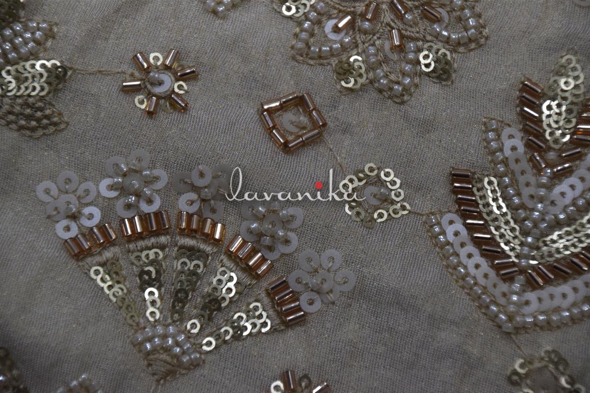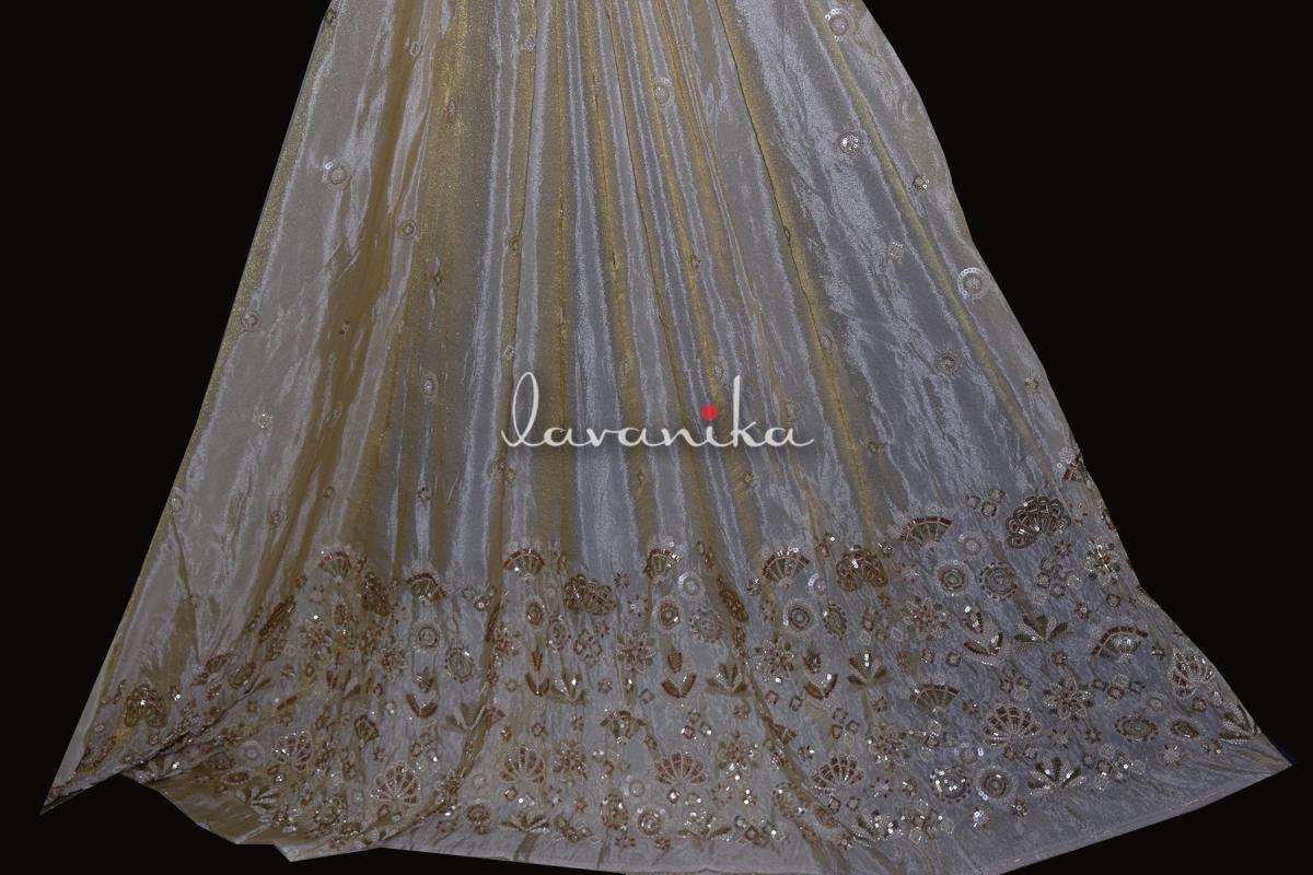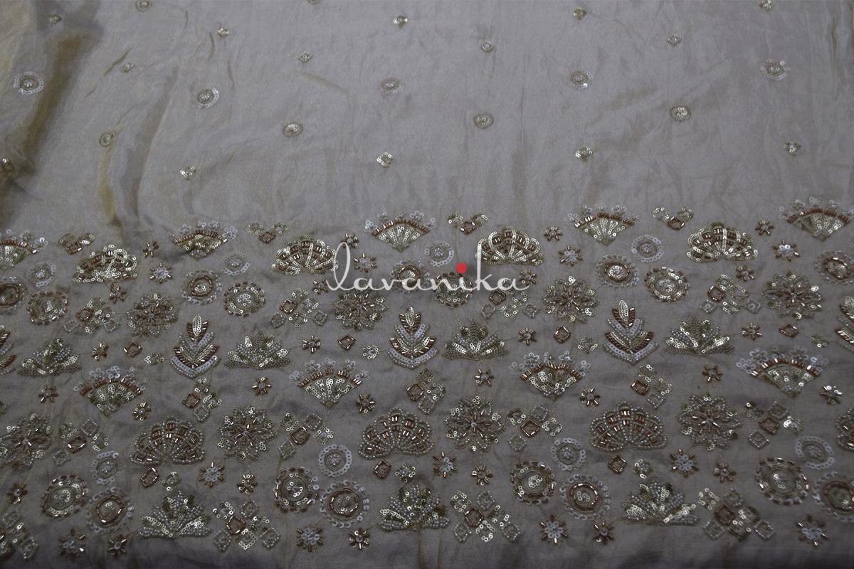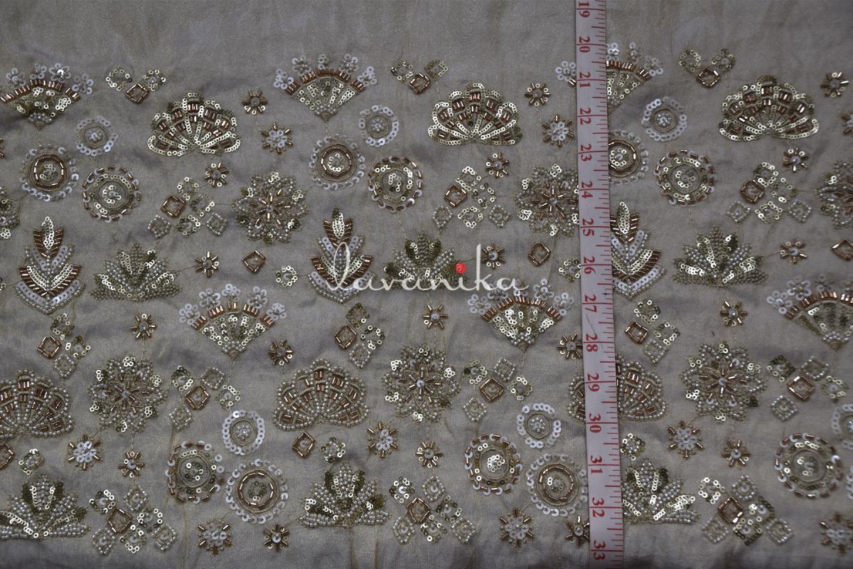 Heavy Daman work on dyeabeTissue Silk Fabric is a piece of artistic hand embroidery that is done using copper and white nalki along with dual sized golden sequins and white sequins. This fabric boasts of various different shapes of flowers meticulously crafted resulting in unique combination of elements that is not only visually stunning but also exudes a sense of opulence and sophistication.