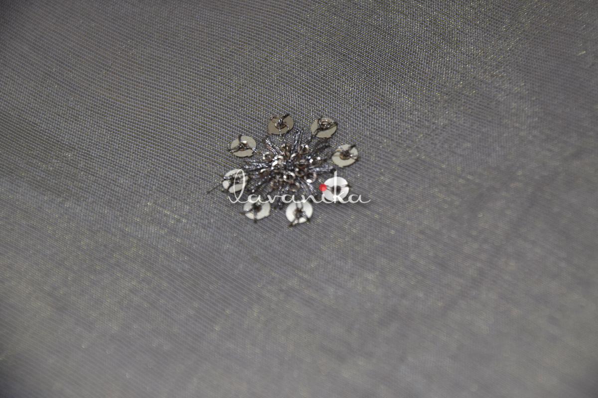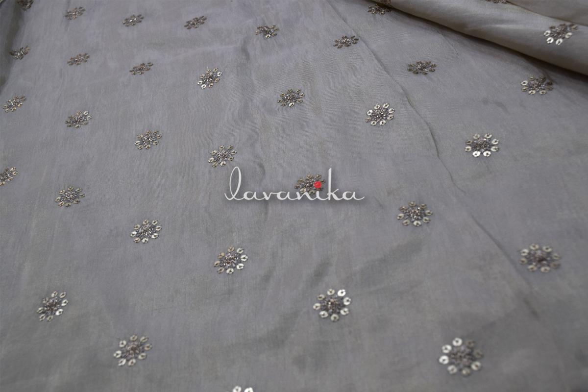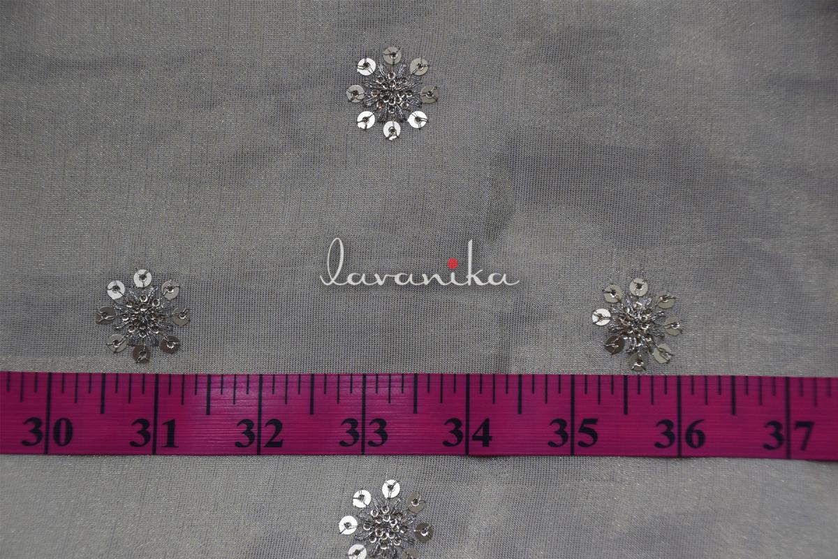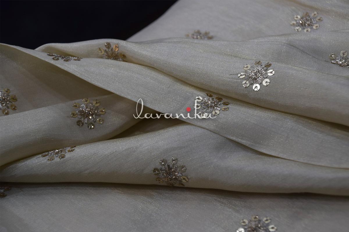 All over booties embroidered with light golden zari and sequin makes a subtle yet beautiful pattern on this Dyeable Viscose Tissue Fabric. This fabric is soft on skin and gives a nice drape. It can be used to make various ethnic, western and fusion garments as well as home decor items and other accessories