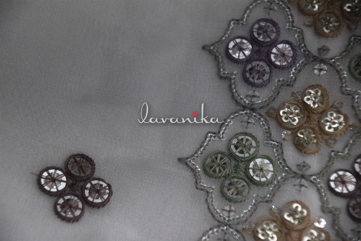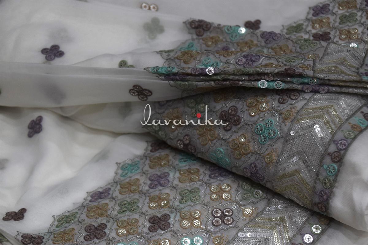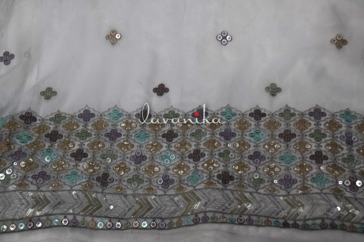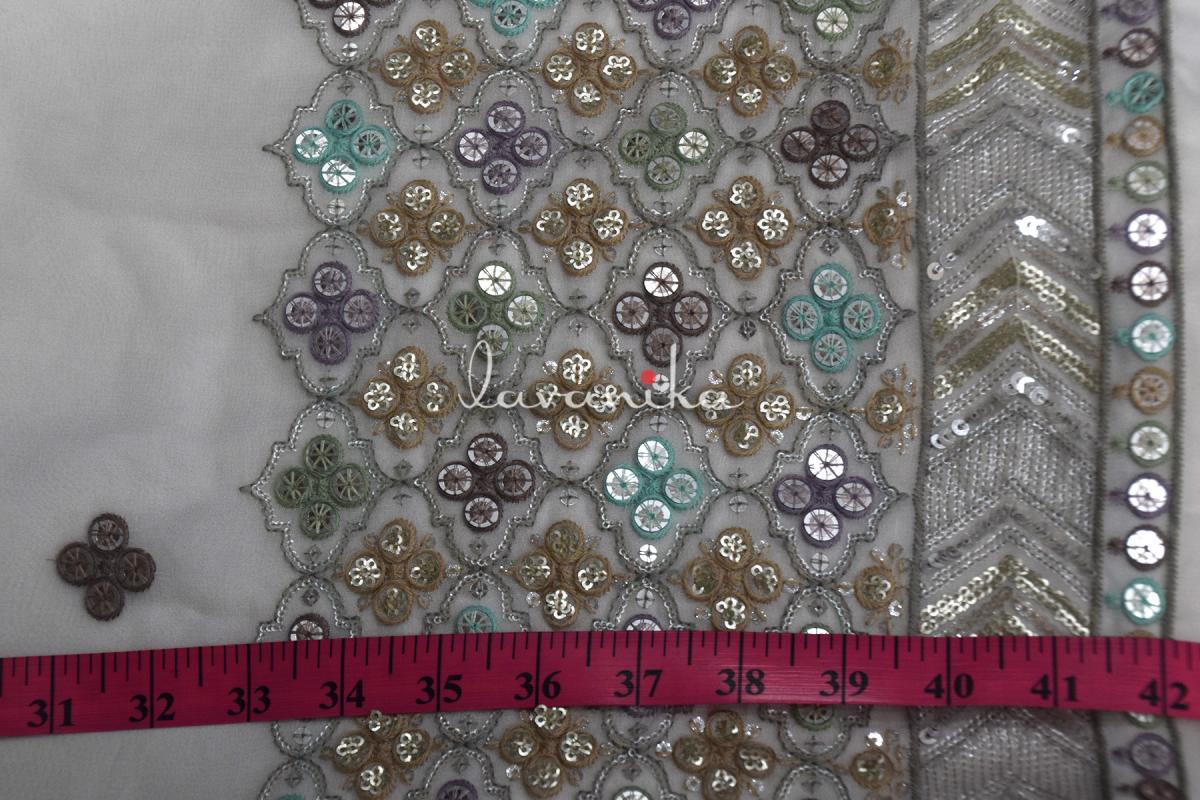 This beautiful dyeable Viscose georgette fabric is machine embroidered fabric that can be used for traditional Indian wear, ethnic wear as well as fusion wear. Fabric is perfect for uses in blouses, tops, ethnic wear, lehengas, dupattas, capes and fusion dresses. Multi color Thread & dual sized Sequin Embroidery exudes sophistication and timeless elegance. The smooth viscose georgette fabric base provides a soft drape, making it perfect for evening gowns, traditional outfits, and luxurious home decor.