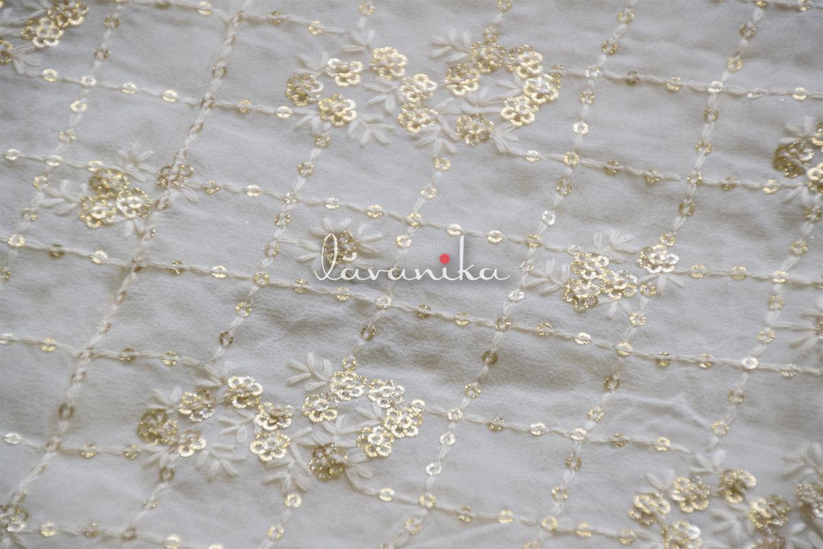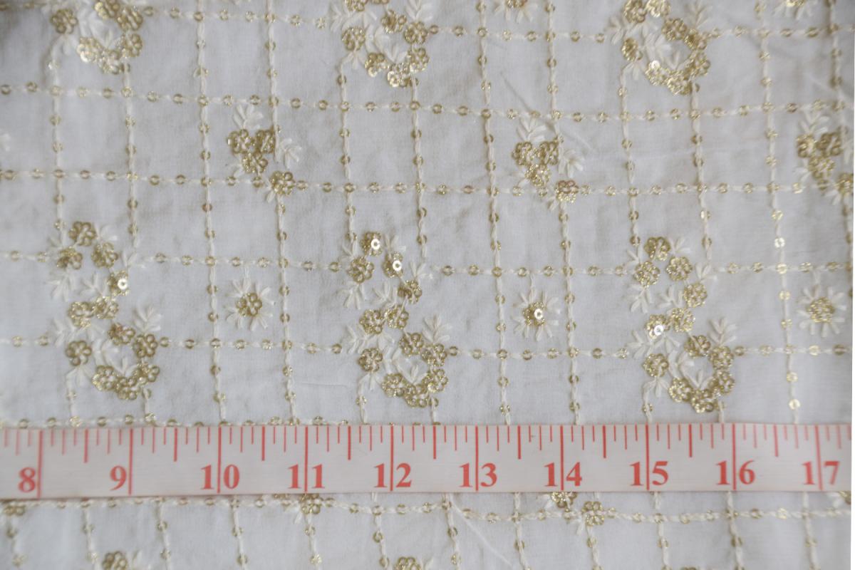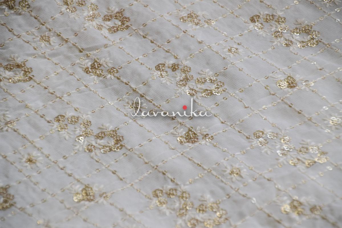 The Glitter gold sequin butta with dyeable thread jaal on dyeable viscose georgette fabric is a beautiful design and can be used to create elegant garments as well as home styling products. Fabric width is 44 inches and work width is 38-40 inches. Please check a small swatch for colors as sometimes viscose does not take exact shades of neons and very bright colors