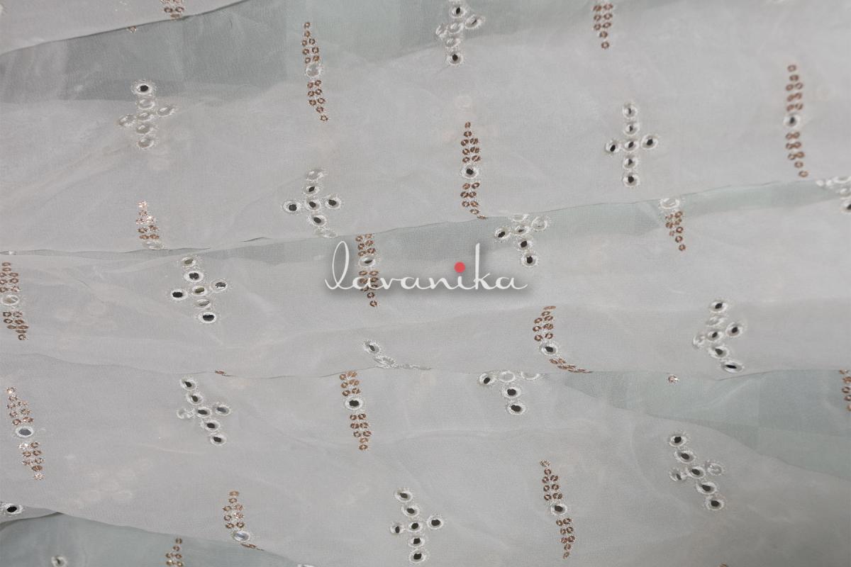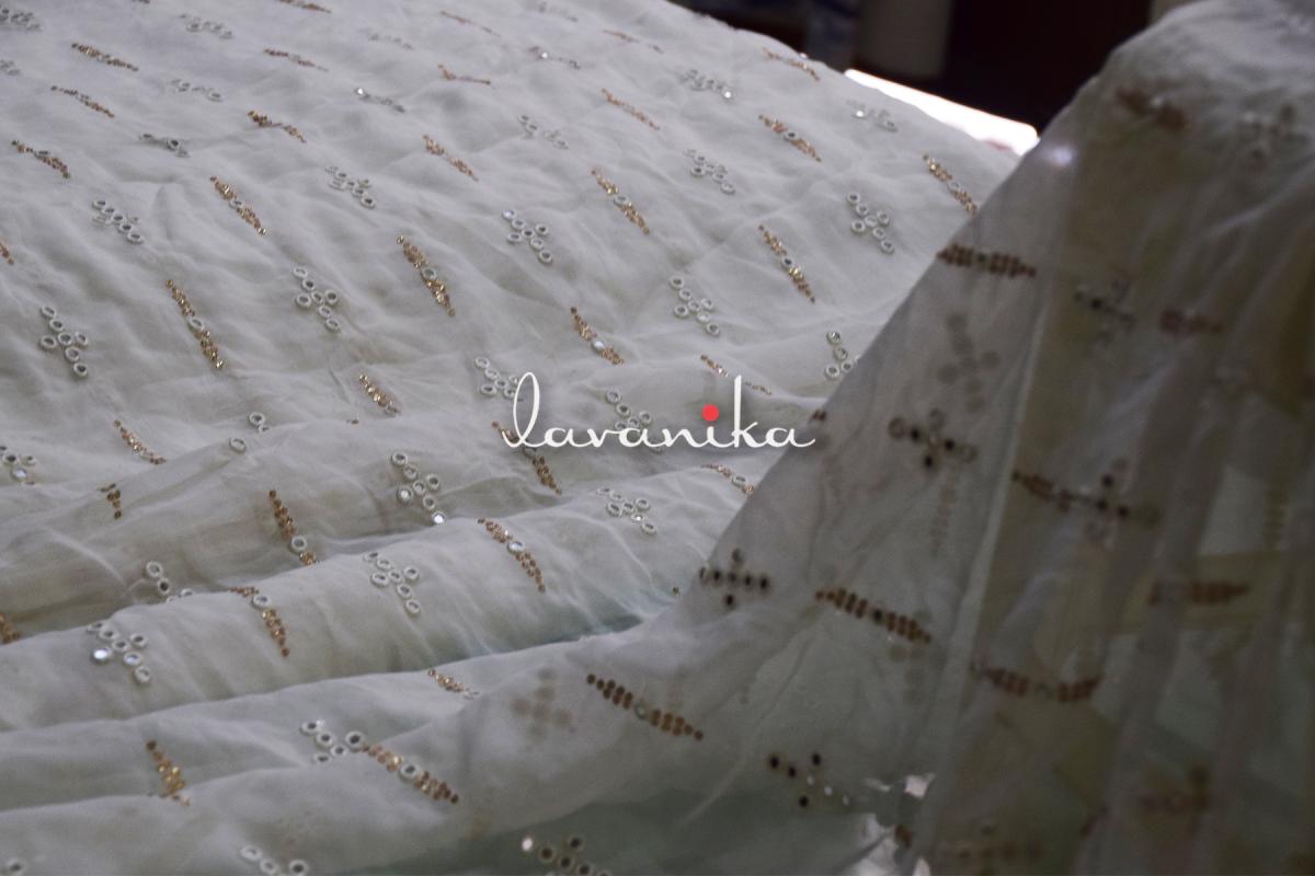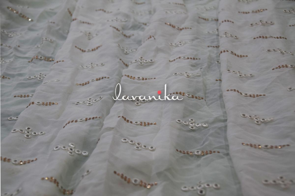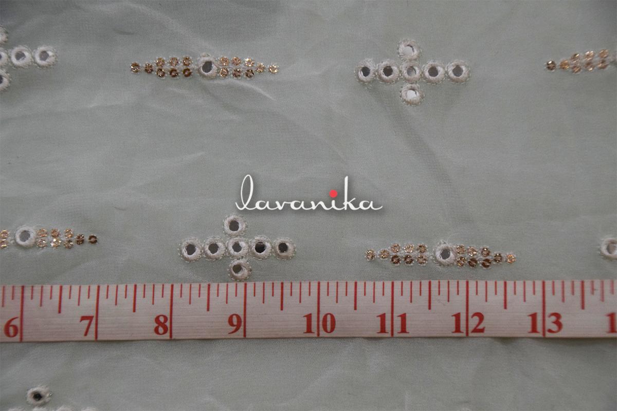 This fabric is a beautiful combination of Dyeable thread work with Glitter Gold Sequin and faux mirror work on dyeable viscose georgette base. The width of this fabric is 44 inches. Please check a small swatch for colors as sometimes viscose does not take exact shades of neons and very bright colors