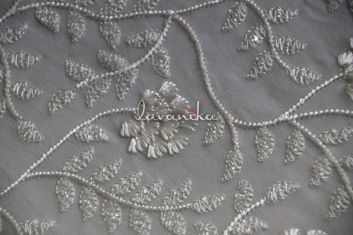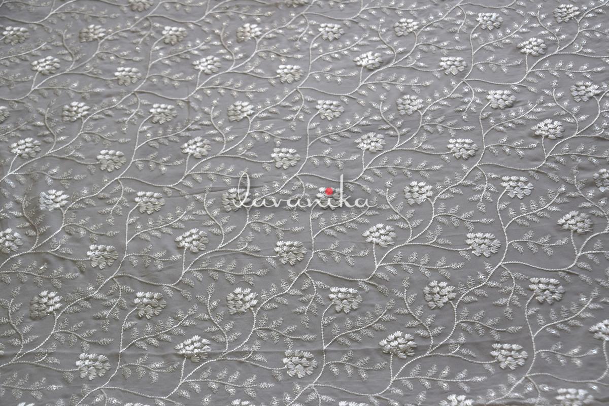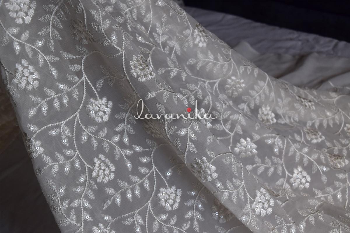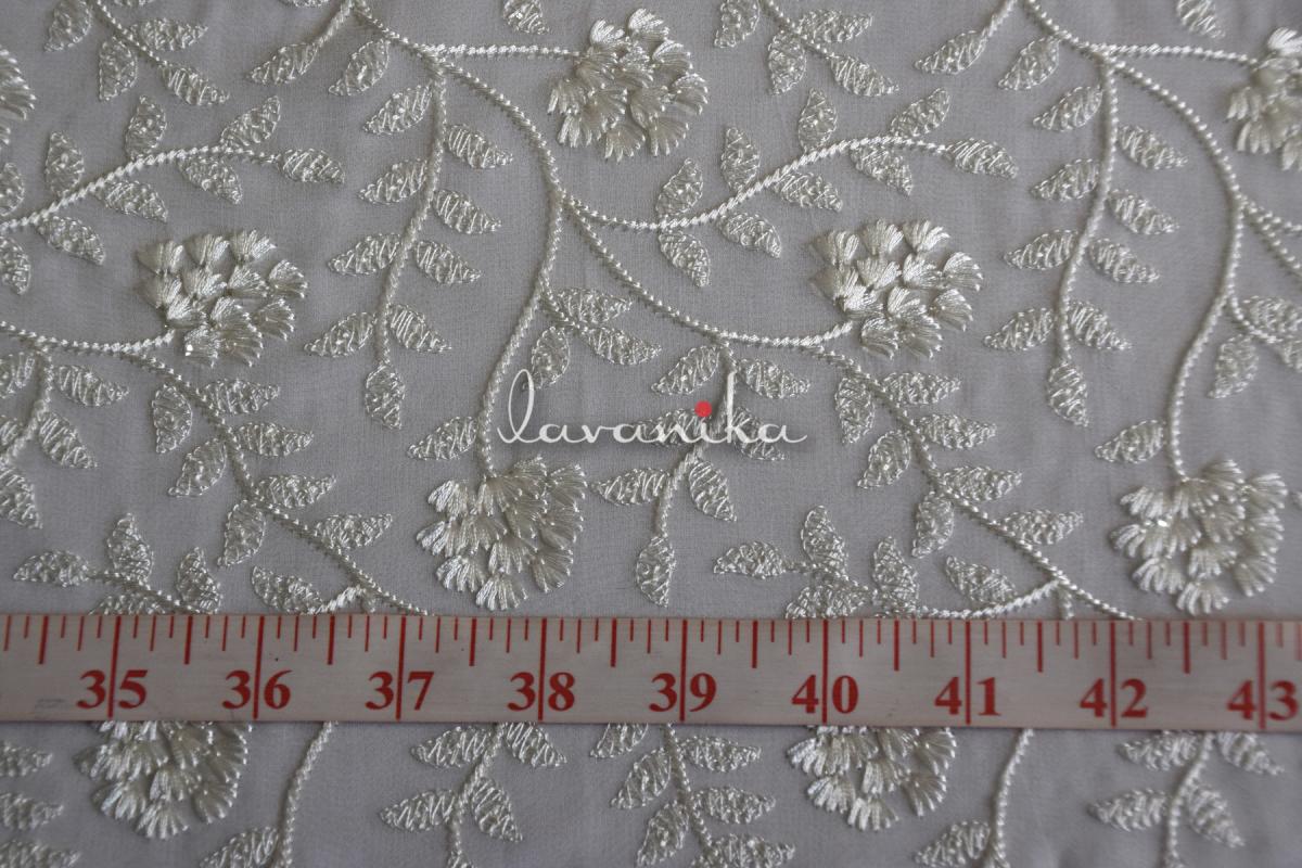 Dyeable thread with a highlight of sequin work on dyeable Viscose Georgette Fabric will make all kinds of dresses look out of heaven. Fabric width is 44 inches and work width is 38-40 inches. Both thread and Fabric are dyeable. Please check a small swatch for colors as sometimes viscose does not take exact shades of neons and very bright colors