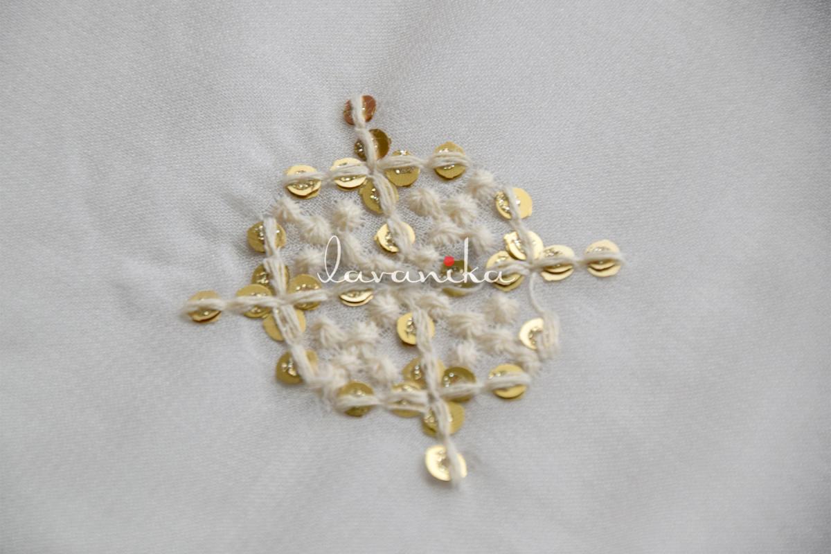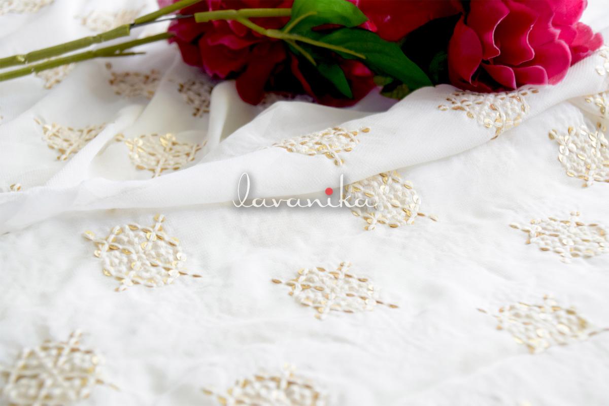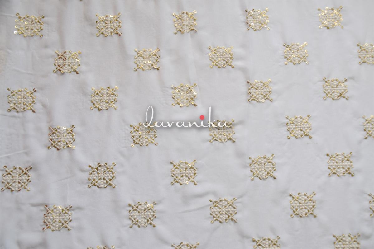 Dyeable thread embroidery with Glitter Gold and matt Gold Sequin on dyeable Viscose Georgette fabric with width of 44 inches and work width of 36-39 inches is perfect for sarees, lehengas, blouse, dresses and suits. The fabric and the thread, both are dyeable. Please check a small swatch for colors as sometimes viscose does not take exact shades of neons and very bright color