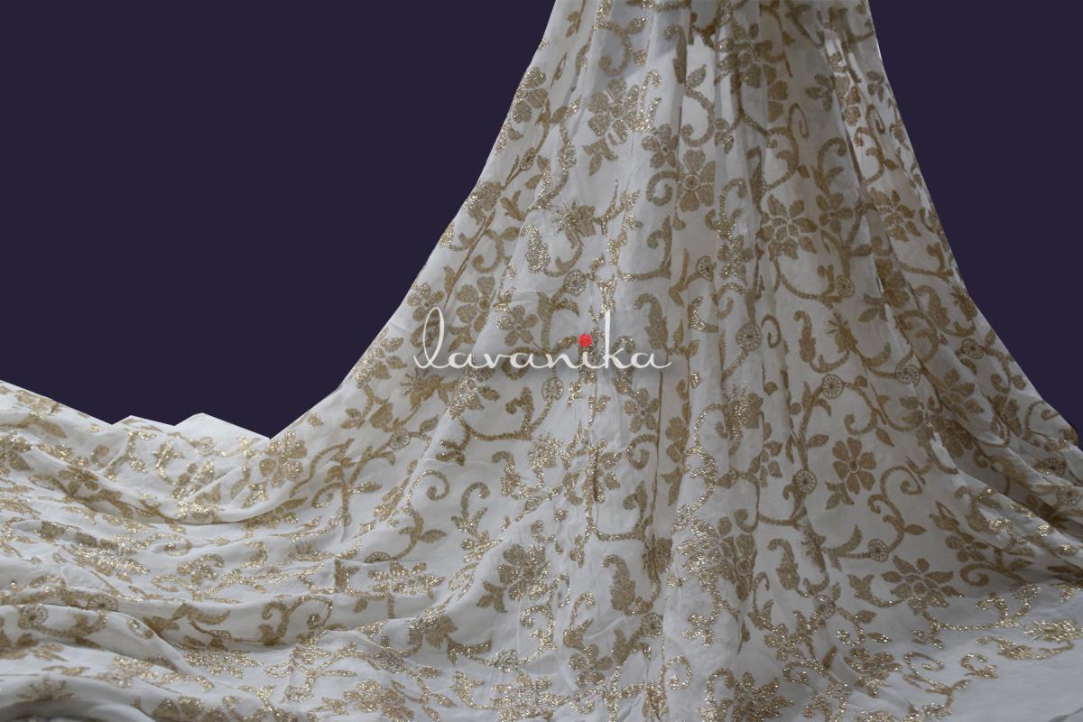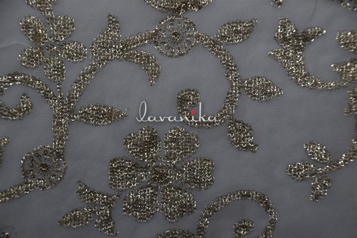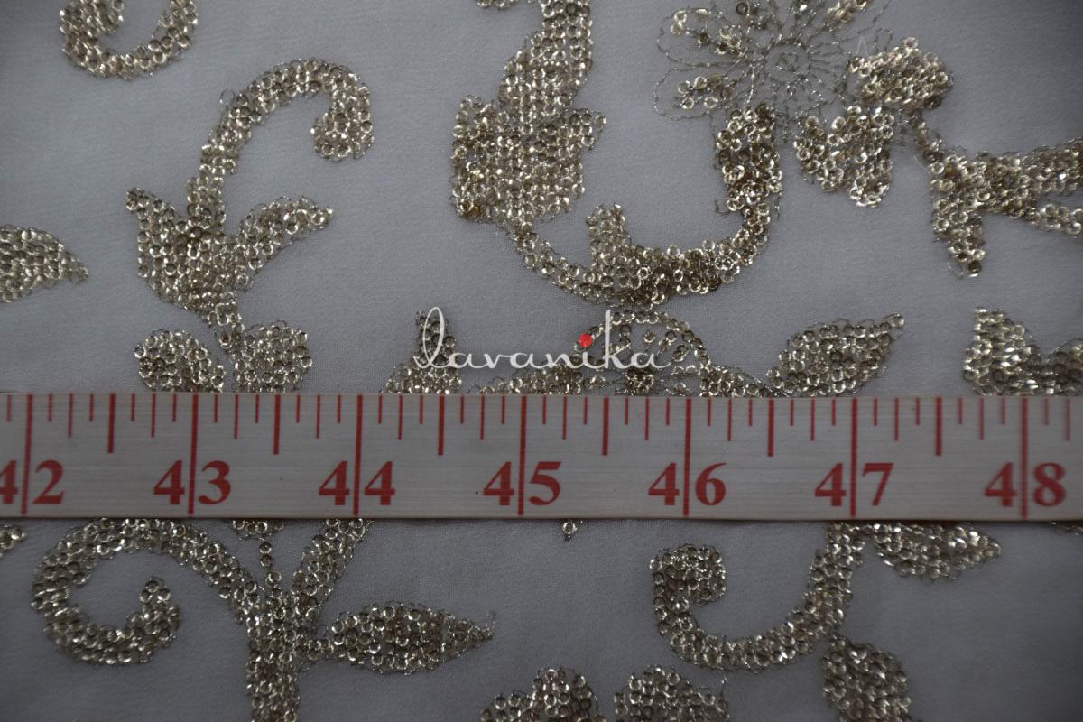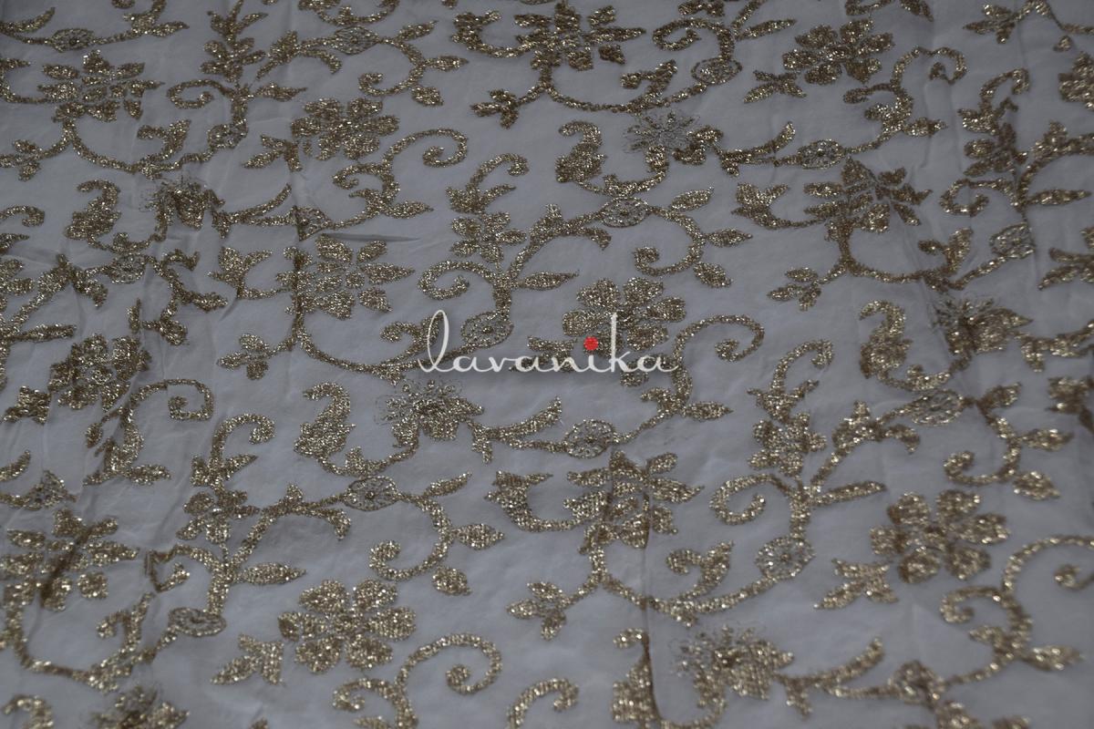 The mix of golden sequin work along with highlights of zari thread creates a play of light and shadow that adds depth and dimension to the all over floral embroidery on Dyeable Viscose georgette fabric. This fabric is trendy and it can be used to create a wide array of ensembles as well as accessories