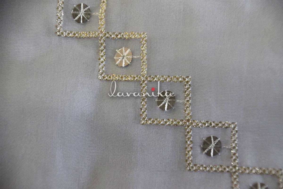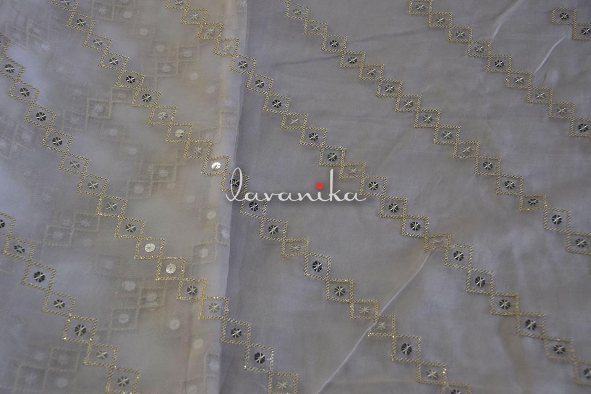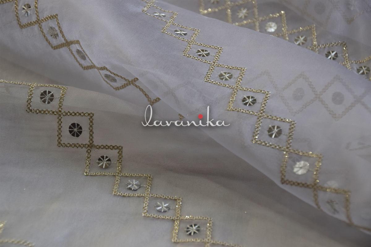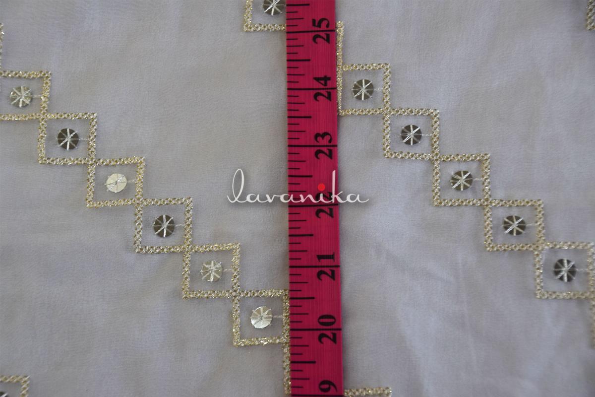 Silver Sequin, Dyeable Thread and Golden Zari embroidery on Dyeable Nylon Organza Fabric is a beautifully crafted fabric and can be used to create various ethnic and western garmnets. It can also be used to make accessories and upholstery.