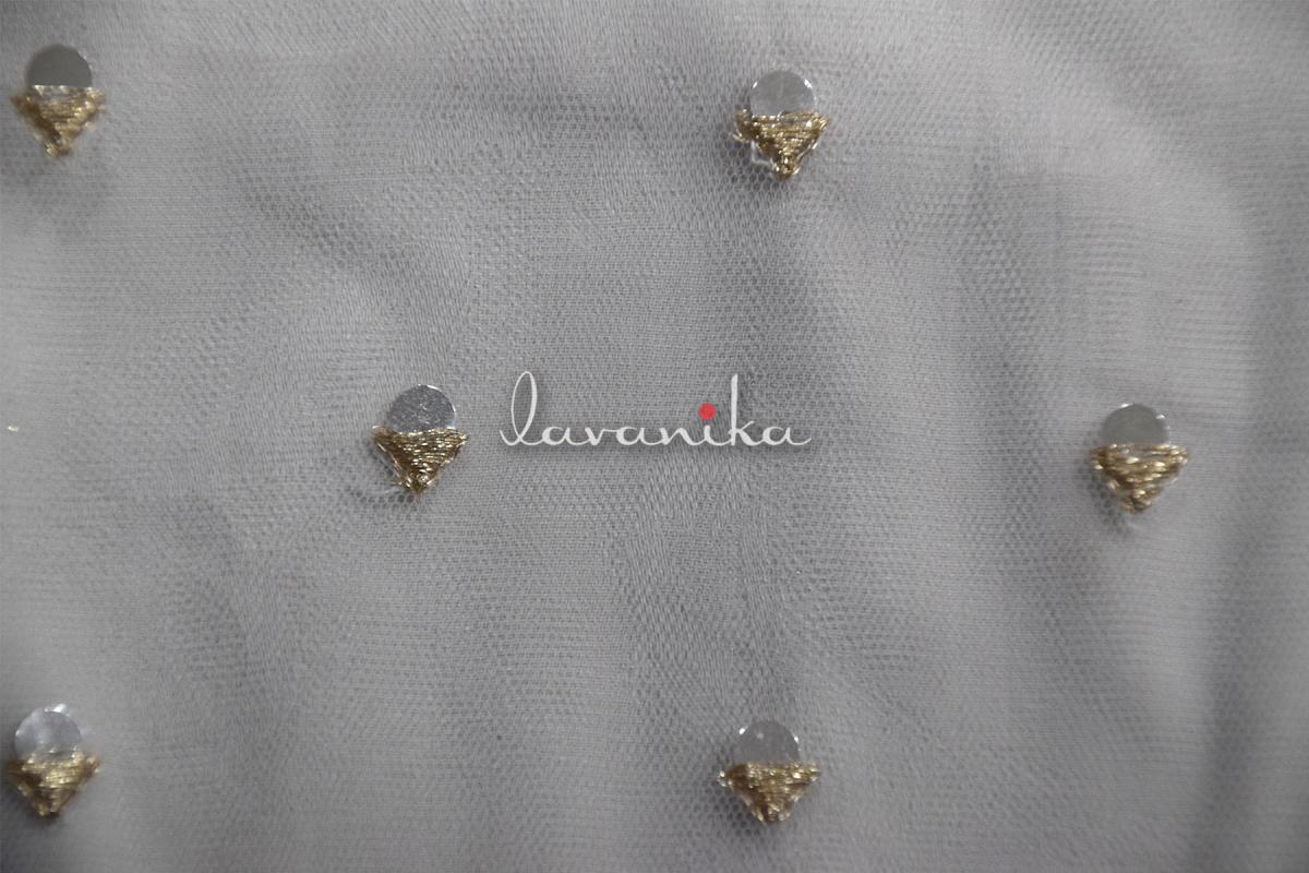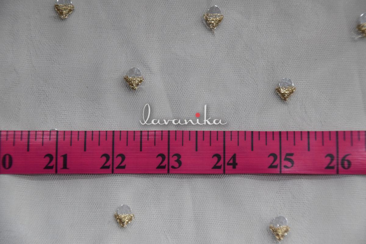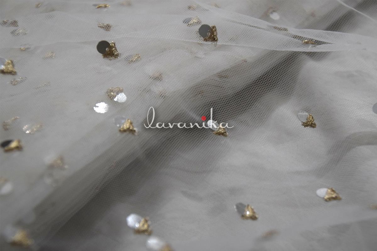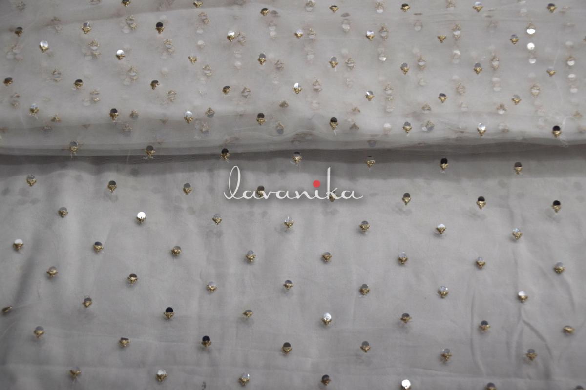 Silver Sequin Circles with zari embroidery base on dyeable Nylon net with fabric is a claasic all over buta design that can be used in multiple ways for creating different kinds of garments as well as decorative items