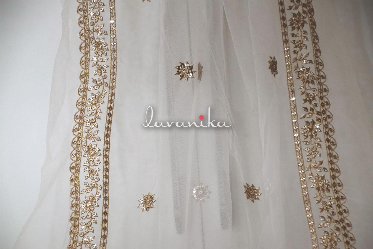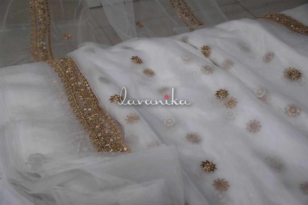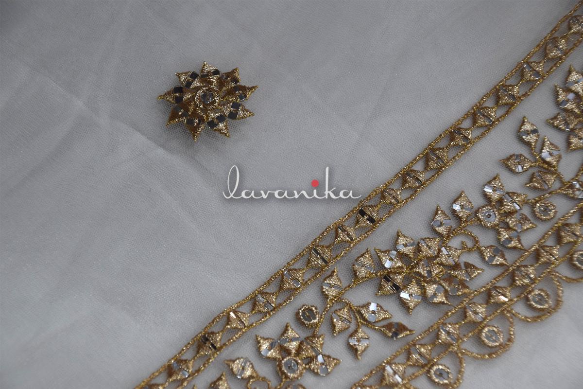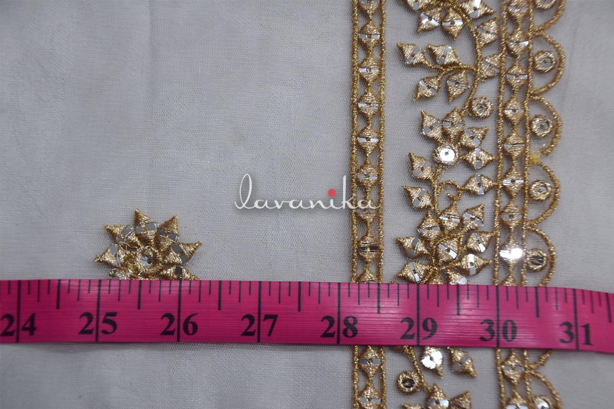 This beautiful fabric having Matt silver Sequin and golden Zari work with Scalloped edges on Dyeable Nylon net Fabric is a piece of art. Suitable for making Dupattas, this is a must buy. It can also be used make other ethnic dresses