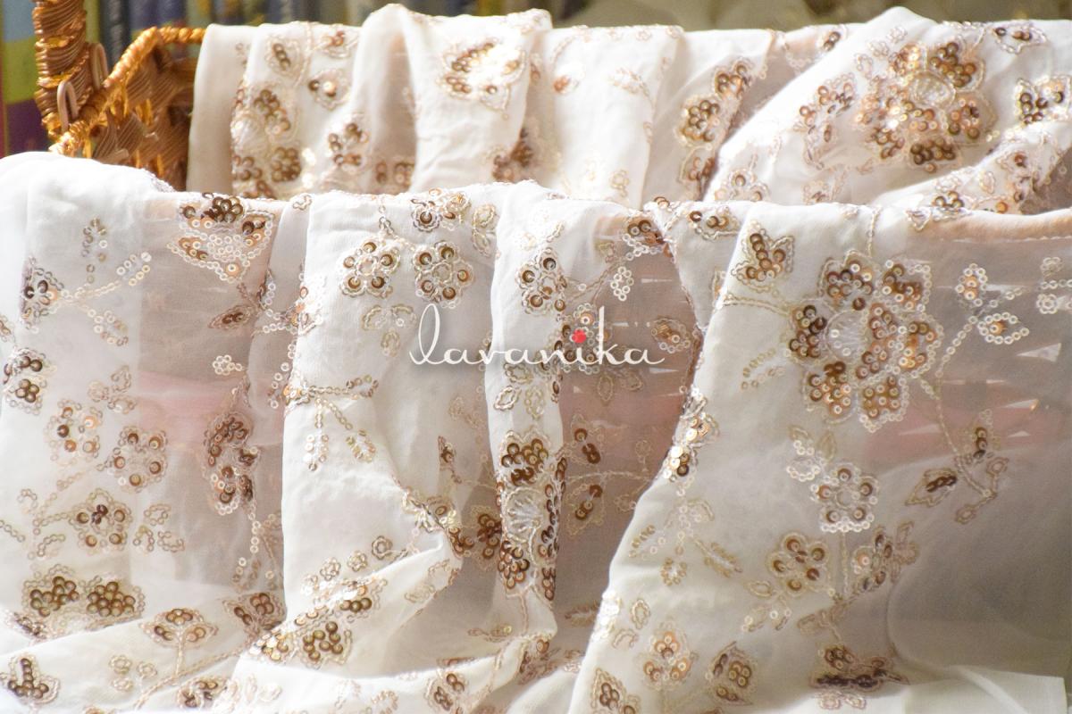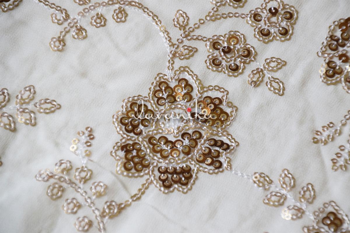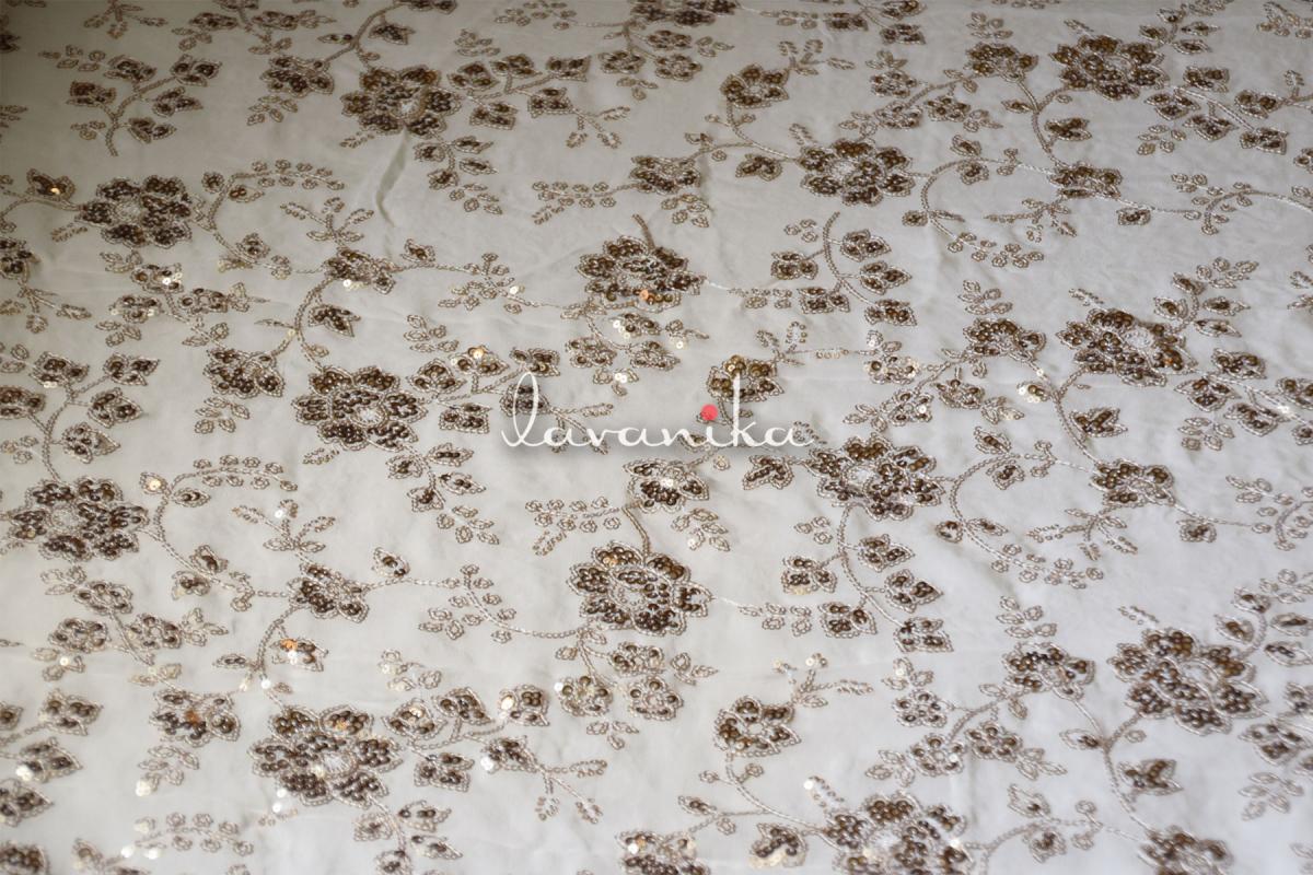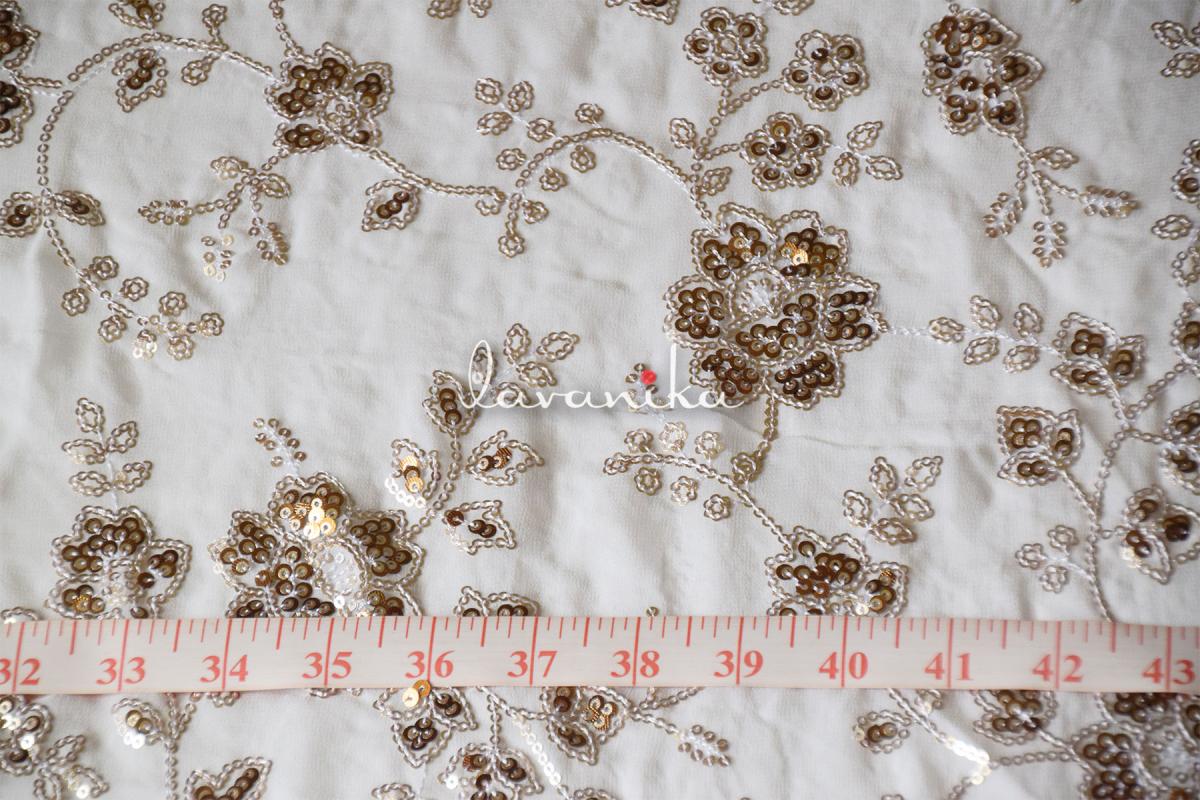 Sequin floral embroidery in Copper and Glitter light gold color on dyeable viscose georgette fabric is a beautiful piece of craftsmanship and is sure to make every dress fabulous. Fabric width is 44 inches and work width is 38-40 inches. Please check a small swatch for colors as sometimes viscose does not take exact shades of neons and very bright colors