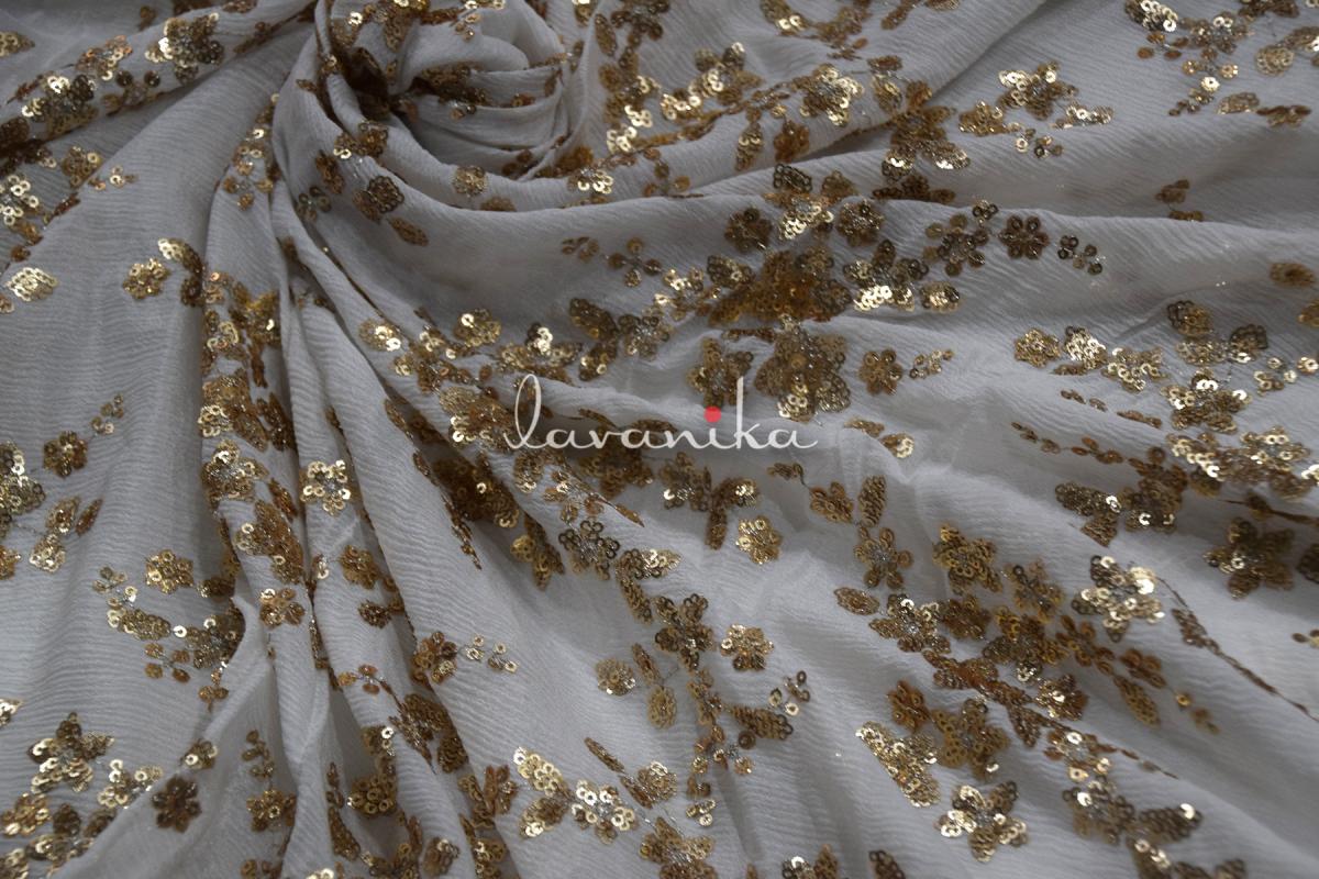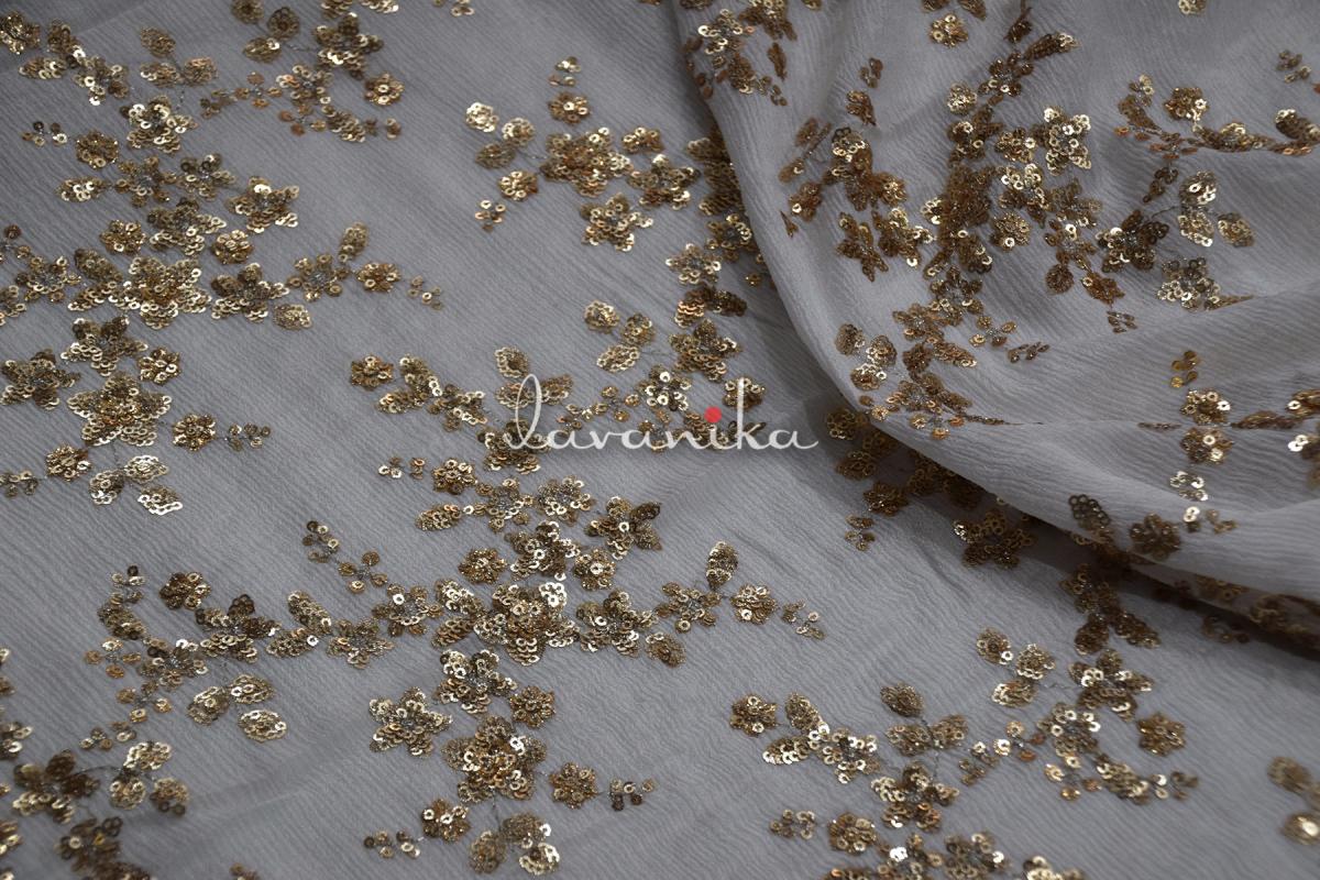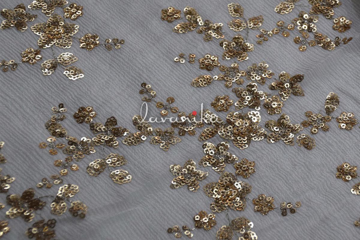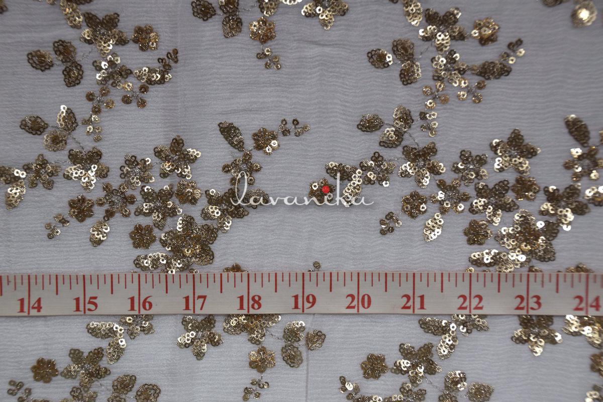 Beautiful Copper and golden color sequin floral all over work on viscose chinnon chiffon fabric is a stunning piece of art. It is suitable for making sarees, suits, shirts, dresses and other decorative items. Fabric width is 44 inches and work width is 36-38 inches. Please test a swatch before dyeing as sometimes viscose does not pick up neon and very bright colors in exact shades