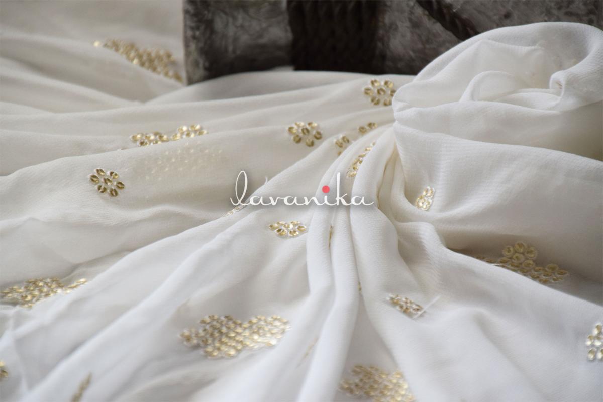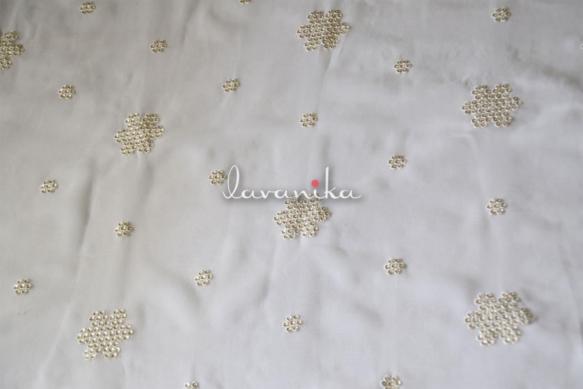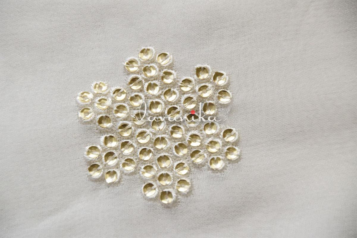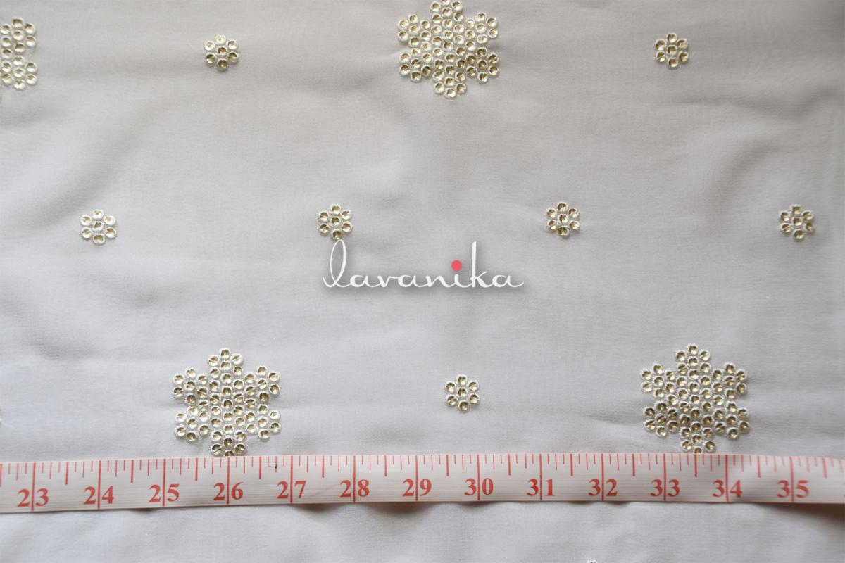 Gold Sequin floral work on Dyeable Viscose Georgette Fabric will make all kinds of dresses look out of heaven. Fabric width is 44 inches and work width is 38-40 inches. Please check a small swatch for colors as sometimes viscose does not take exact shades of neons and very bright colors