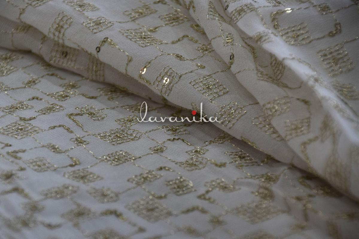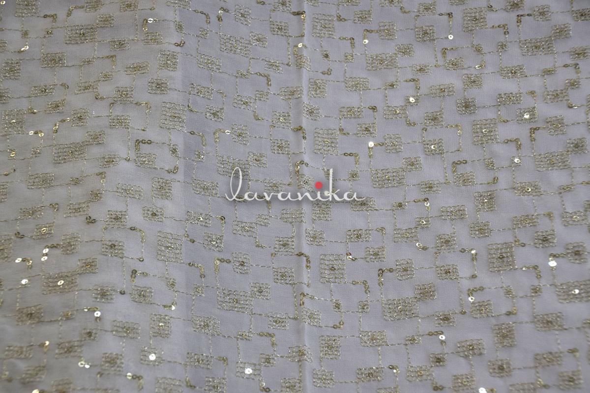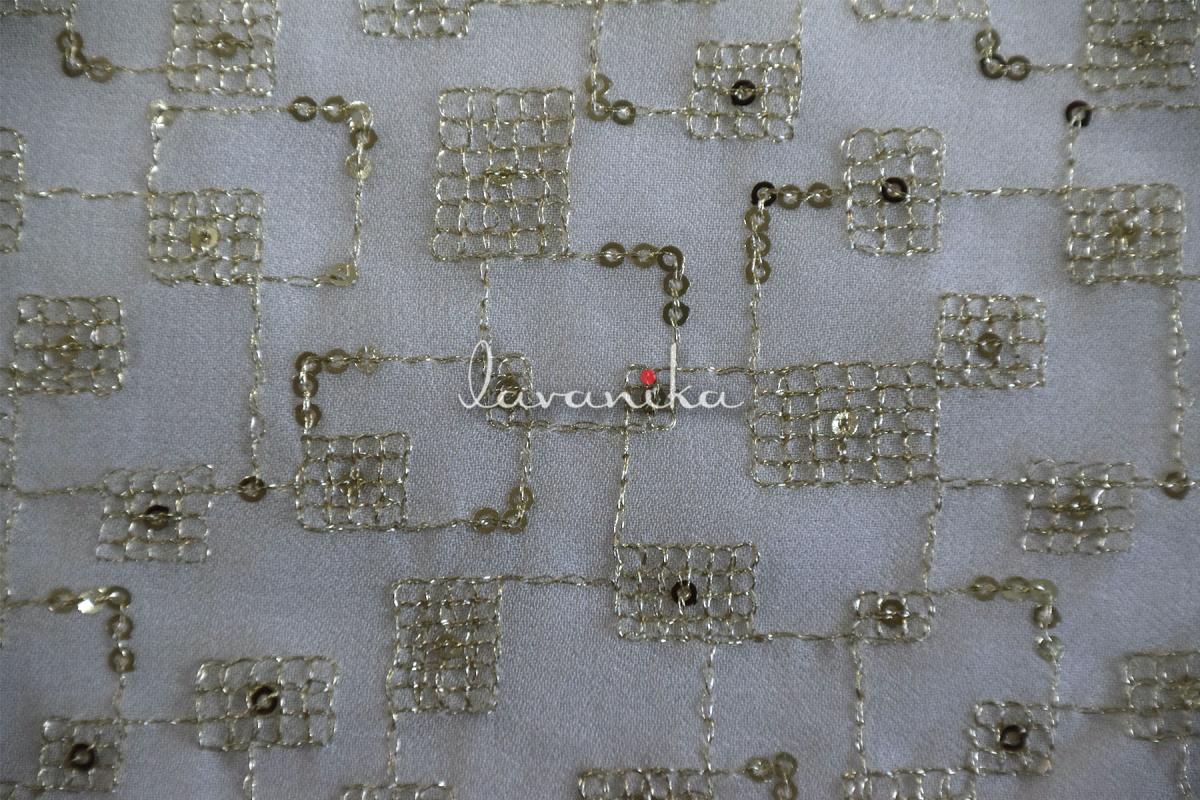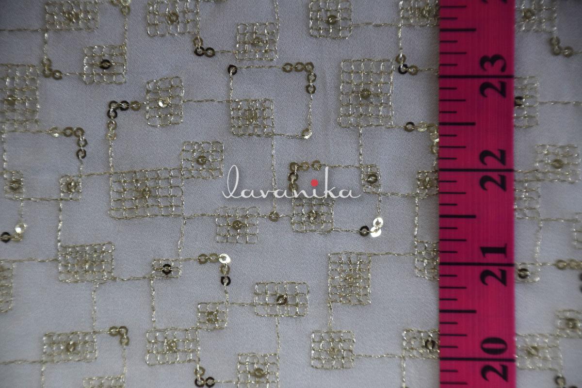 A very interesting interwining of geometrical rectangles embroidered in sequin and Zari on dyeable Viscose Georgette Fabric exudes a royal appeal and will make every item of clothing a treat for the eyes. Please test a swatch for neons as its yarn is viscose