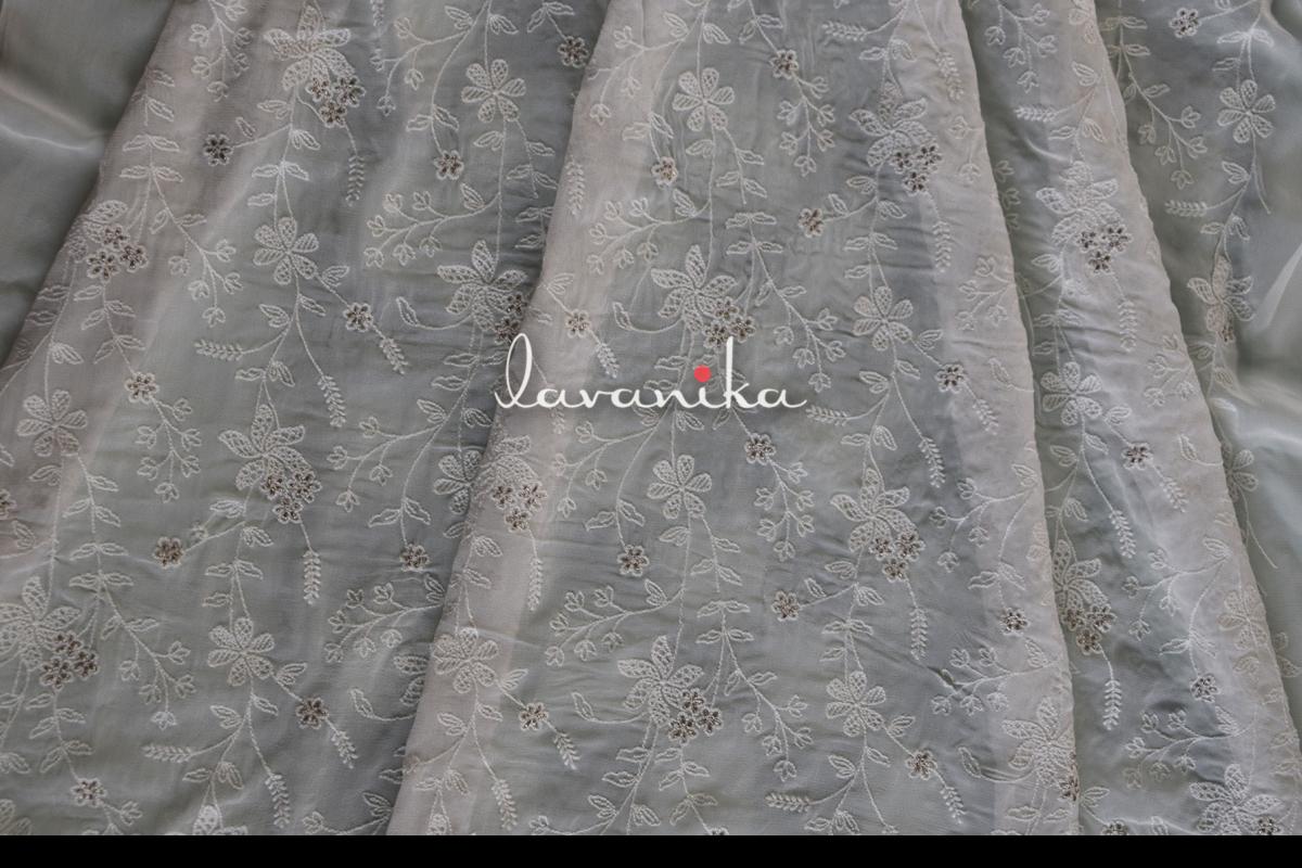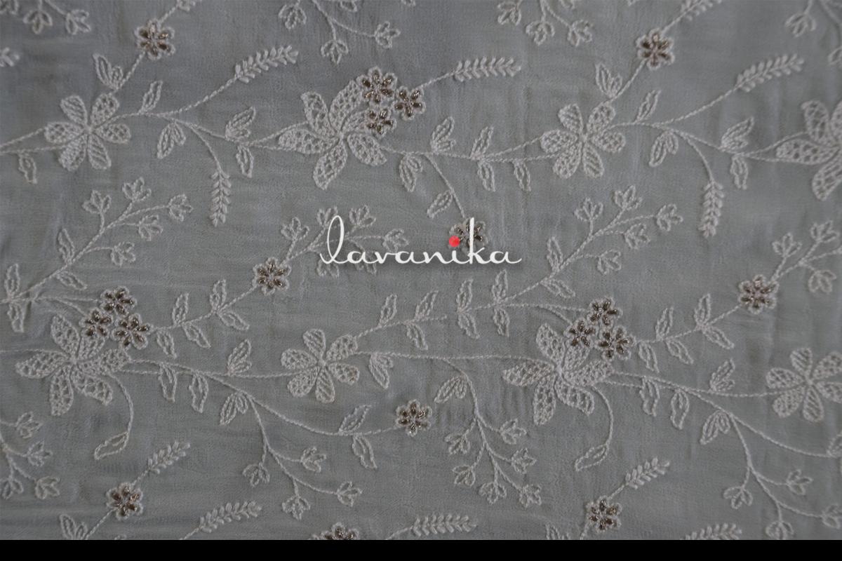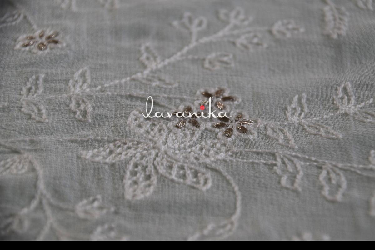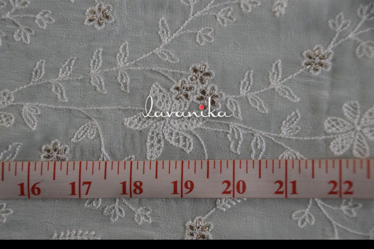 Cotton Dyeable thread with a touch of gold Zari on dyeable Viscose Georgette Fabric will make all kinds of dresses look out of heaven. Fabric width is 44 inches and work width is 38-40 inches. Both thread and Fabric are dyeable. Please check a small swatch for colors as sometimes viscose does not take exact shades of neons and very bright colors