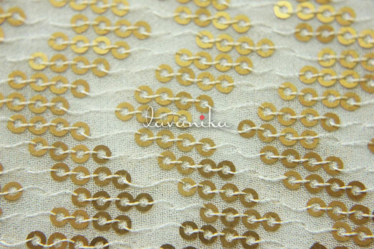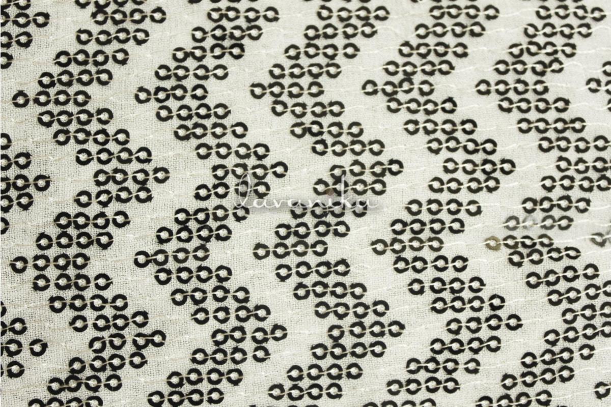 Zig-Zag Black Sequin on Viscose Georgette with fabric width of 44 inches and work width of 36-39 inches. This fabric is is perfect for sarees, lehengas, blouse, dresses and suits. The fabric is dyeable and the sequins will remain the same black color after dyeing of the fabric. Please test a swatch before dyeing as sometimes viscose does not pick up neon and very bright colors in exact shades