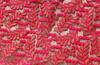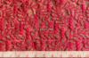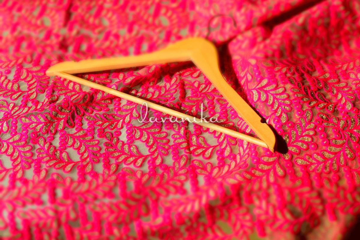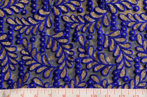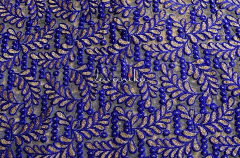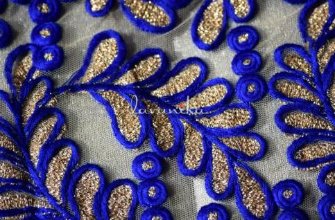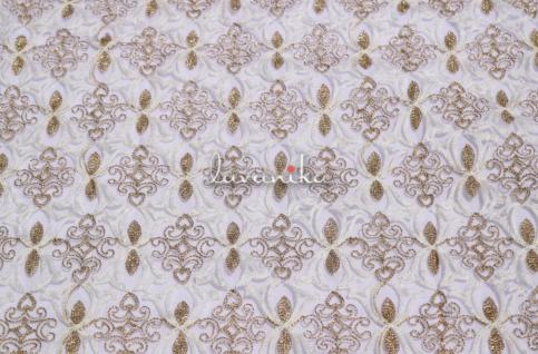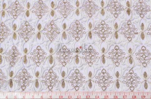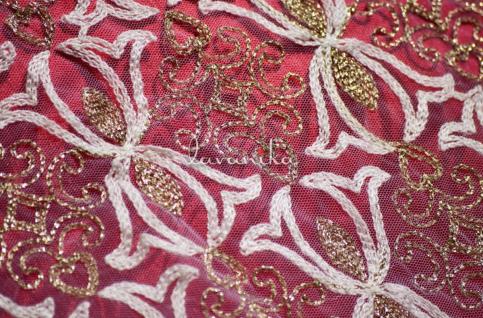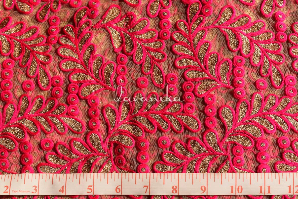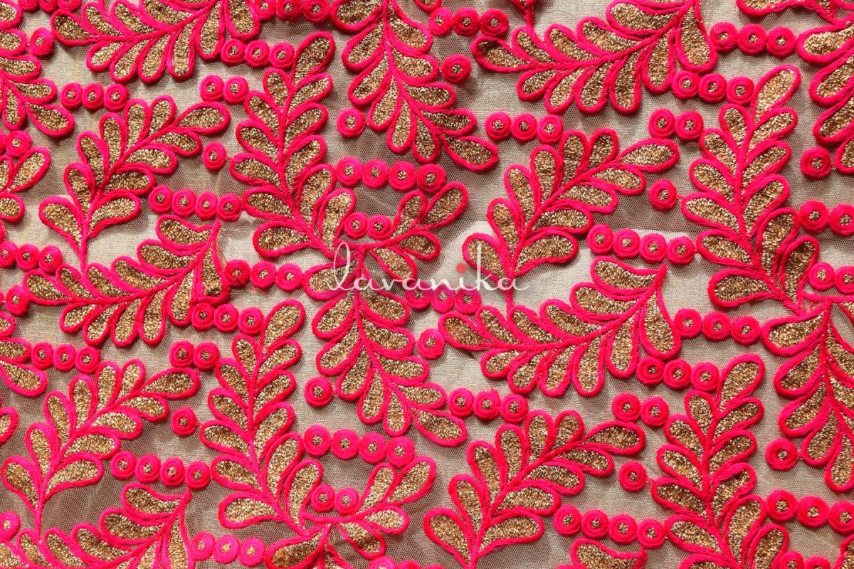 A hickories leaf design with rani pink thread work outline and filled with golden badlaa zari on dyeable white nylon net. The fabric width is 44 inches with work on approx 36-38 inches. The Fabric is dyeable in all colors. It is advisable to try a dye a small cutting first as effect of dyeing badlaa zari can vary from dyer to dyer