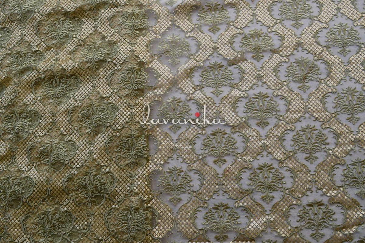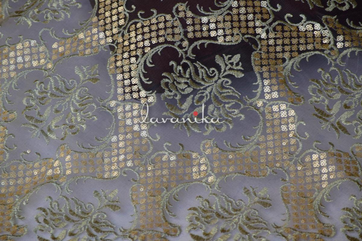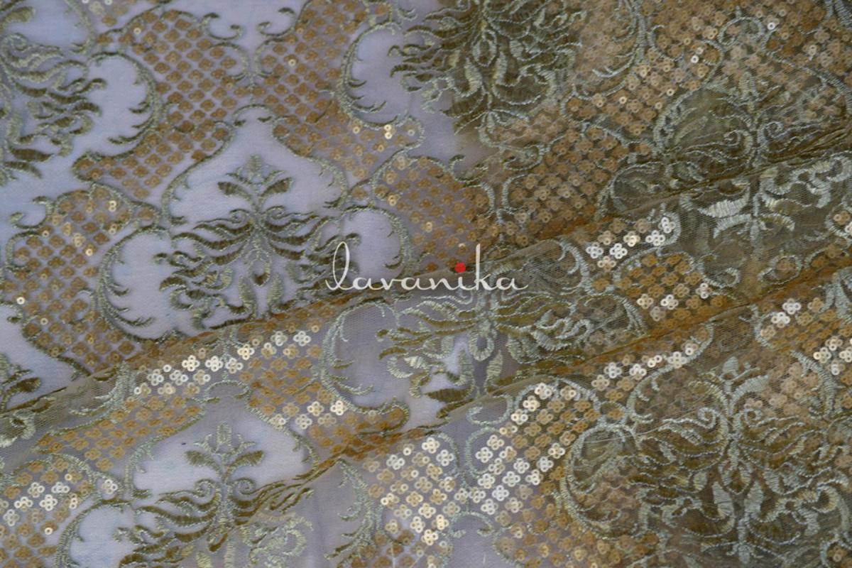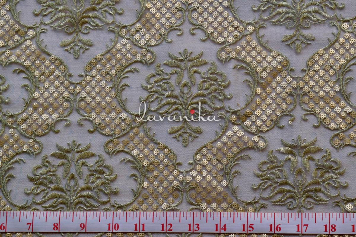 Zari and sequin work on beige silky net is perfect for sarees, lehengas, blouse, dresses and suits, Fabric width is 54 inches and work width of 48-49 inches. This Net is non-dyeable Width: 54.00 inches