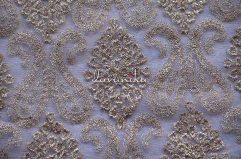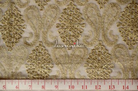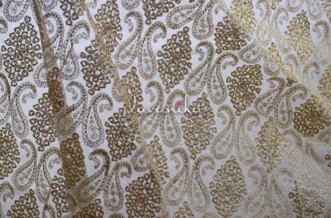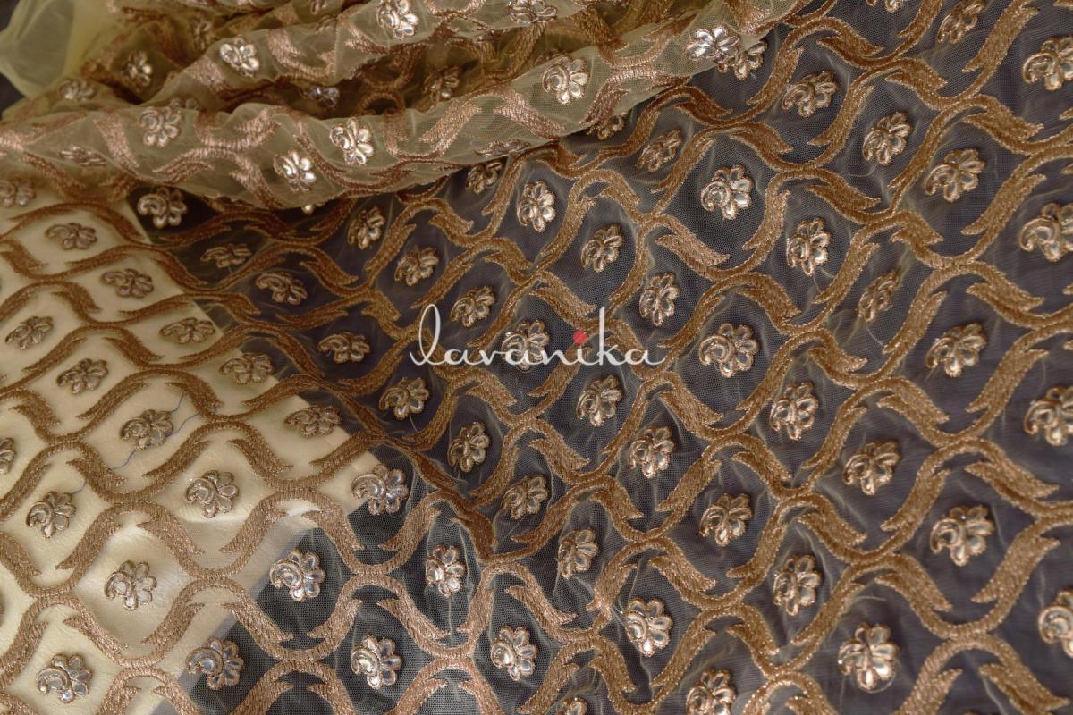 Zari embroidery with faux mirror is perfect for sarees, lehengas, blouse, dresses and suits. Fabric width is 44 inches and work width of 38-39 inches