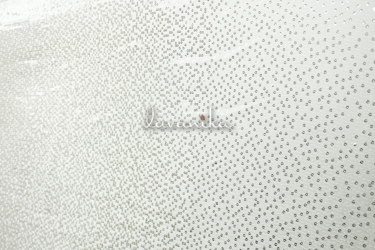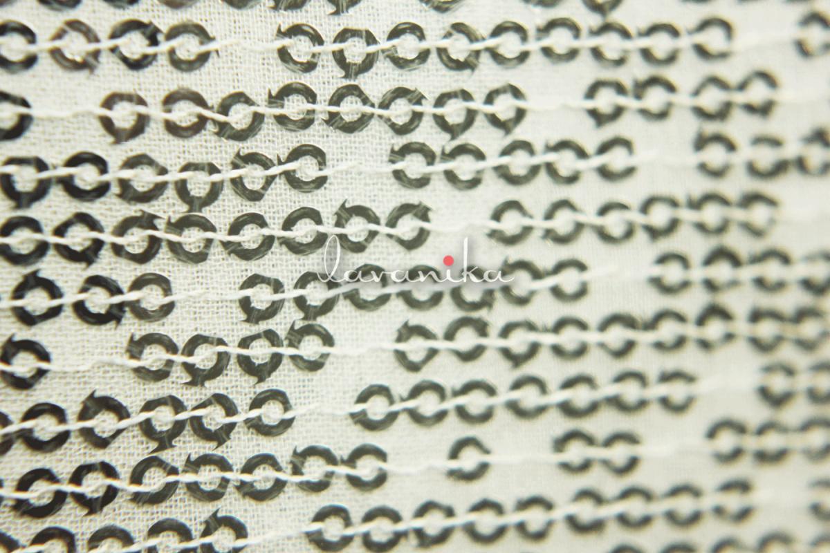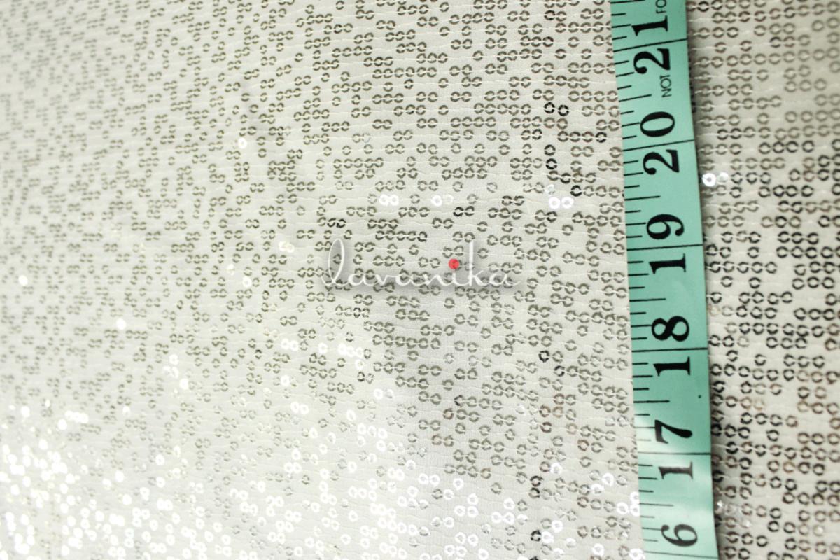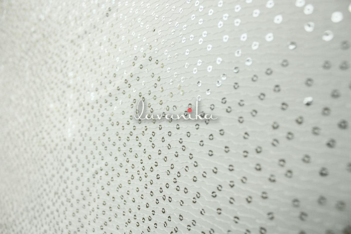 3D Silver Sequin on Viscose Georgette with fabric width of 44 inches and work width of 36-39 inches. This fabric is perfect for sarees, lehengas, blouse, dresses and suits. The fabric is dyeable and the sequins will remain the same color after dyeing of the fabric. Please test a swatch before dyeing as sometimes viscose does not pick up neon and very bright colors in exact shades