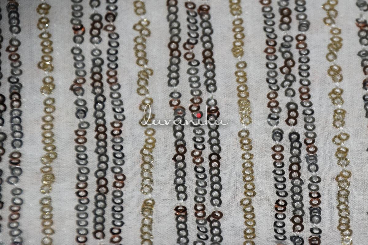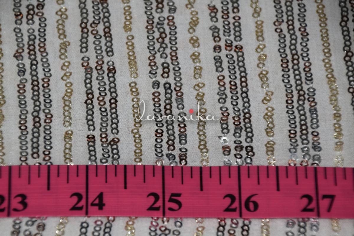 eautiful and evergreen sequin lines in Silver, Copper and glitter golden color on 44 inches dyeable Viscose Georgette Fabric that can be dyed in vibrant colors . The attractive design exuding a royal appeal will make every item of clothing a treat for the eyes.