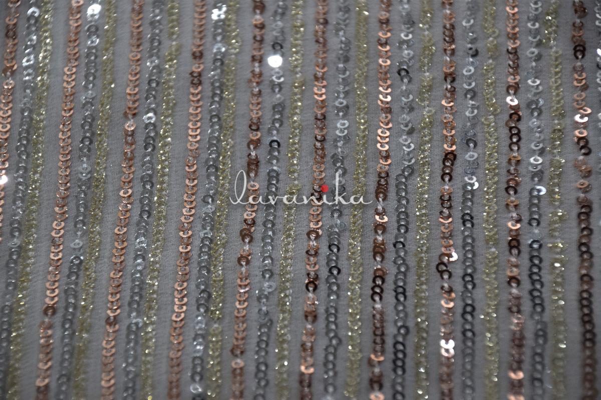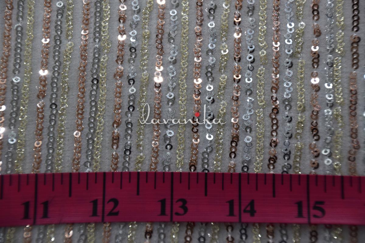 Beautiful and evergreen sequin lines in Silver, Copper and glitter golden color on 44 inches dyeable Viscose Georgette Fabric that can be dyed in vibrant colors . The attractive design exuding a royal appeal will make every item of clothing a treat for the eyes.