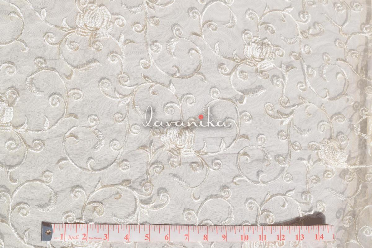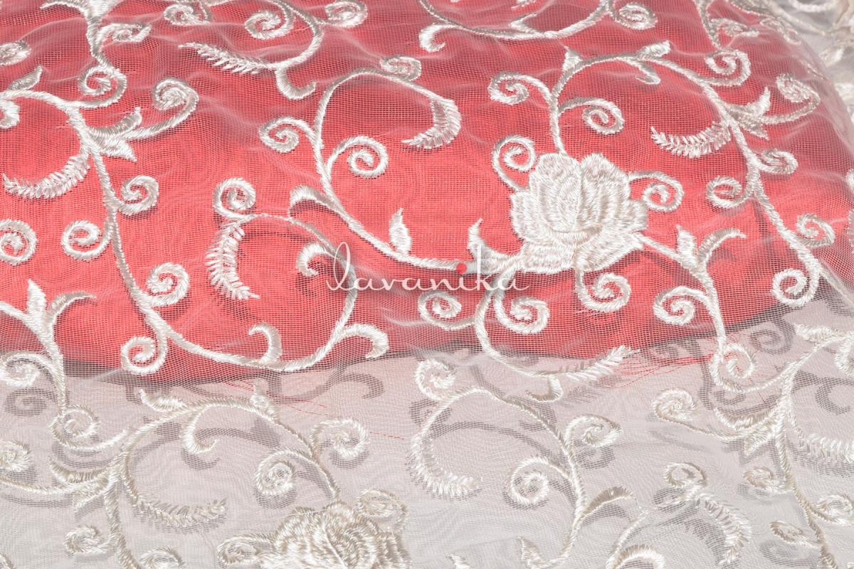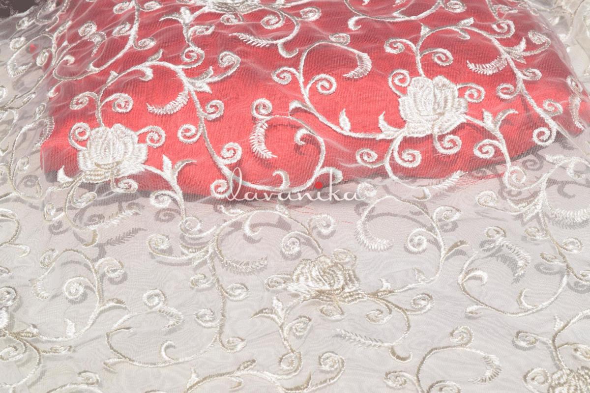Resham thread embroidery on nylon net with fabric width of 44 inches and work width of 36-39 inches is perfect for sarees, lehengas, blouse, dresses and suits. The fabric and the resham thread, both are dyeable