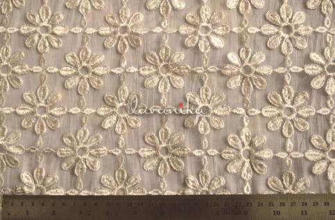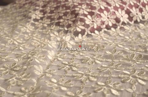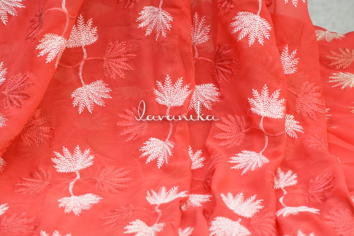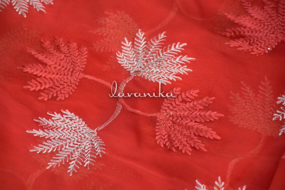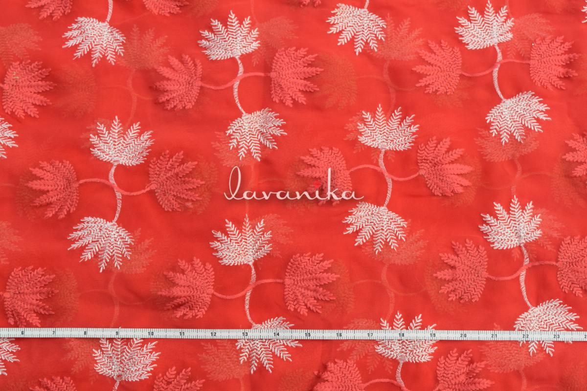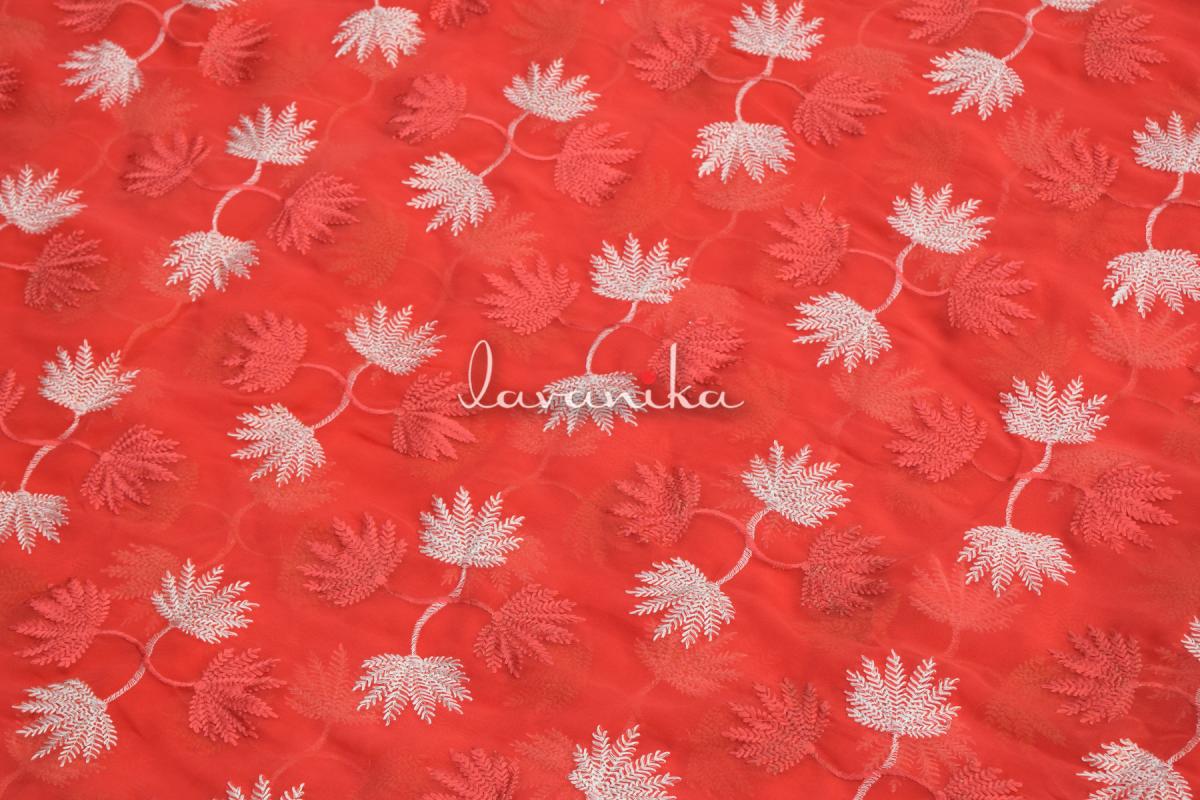 Resham Colored thread Embroidery on mill dyed poly georgette fabric has an eye-catching design is very appealing, it is being demanded for colorfastness and shrink resistance which makes it perfect for shirts, dresses, saree, kurta and decorative items.