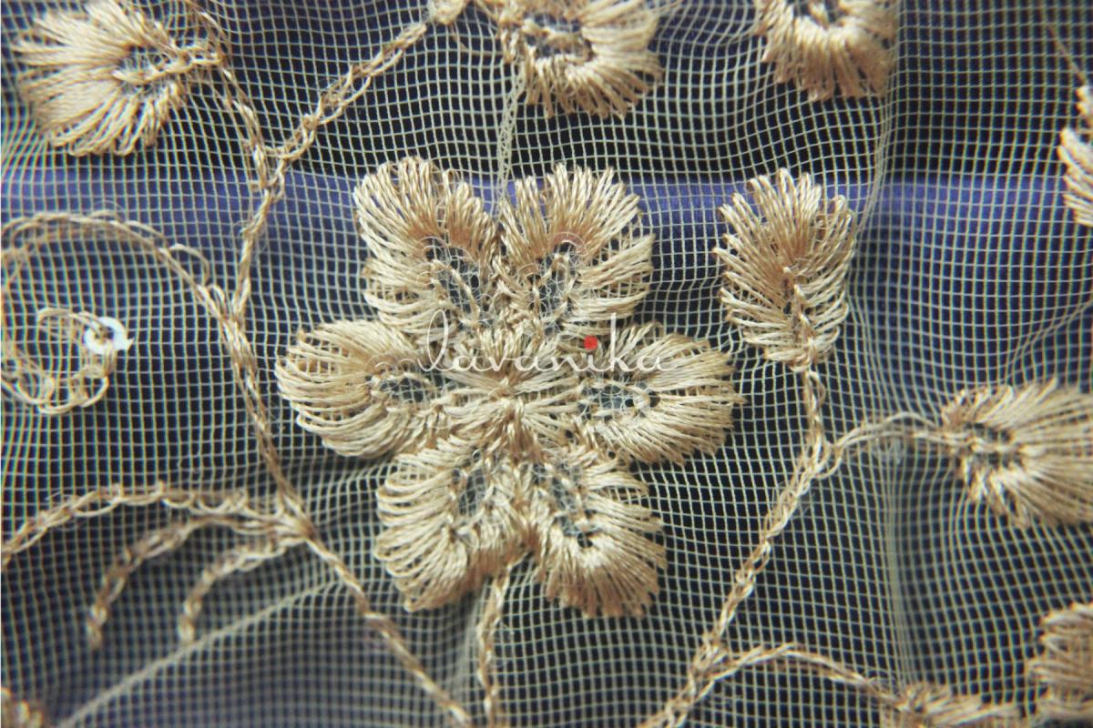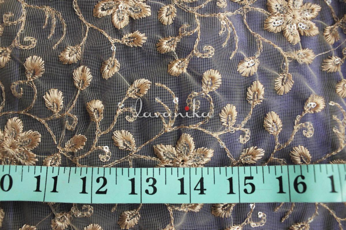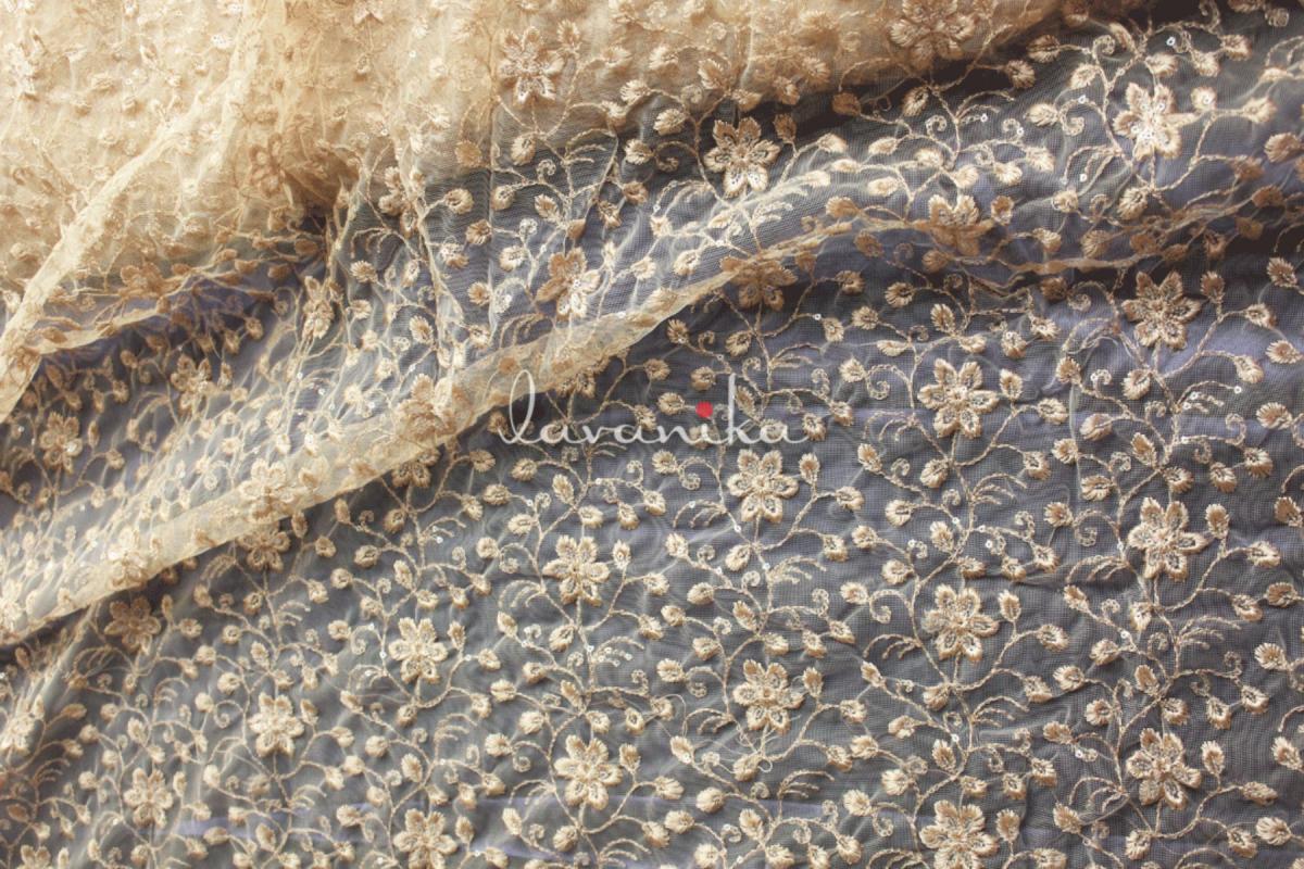 Beige Thread work with clear Sequin on chikoo dyed nylon net with fabric width of 44 inches and work width of 36-39 inches. This fabric is is perfect for sarees, lehengas, blouse, dresses and suits. The fabric is dyeable and the sequins will remain the same after dyeing of the fabric.
